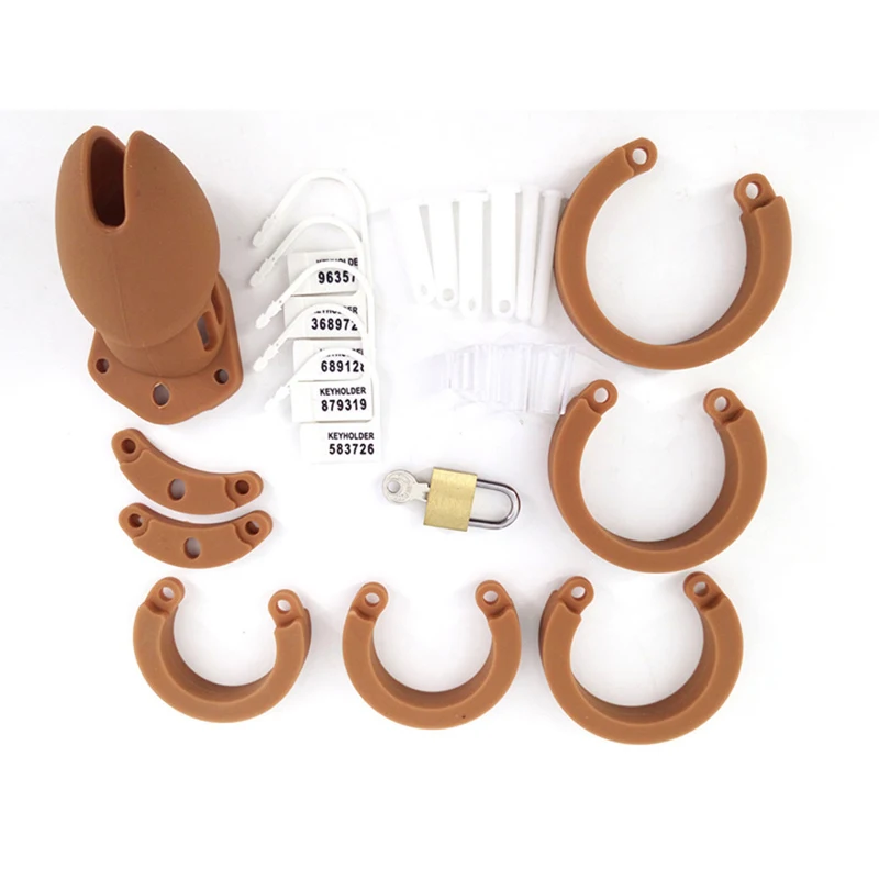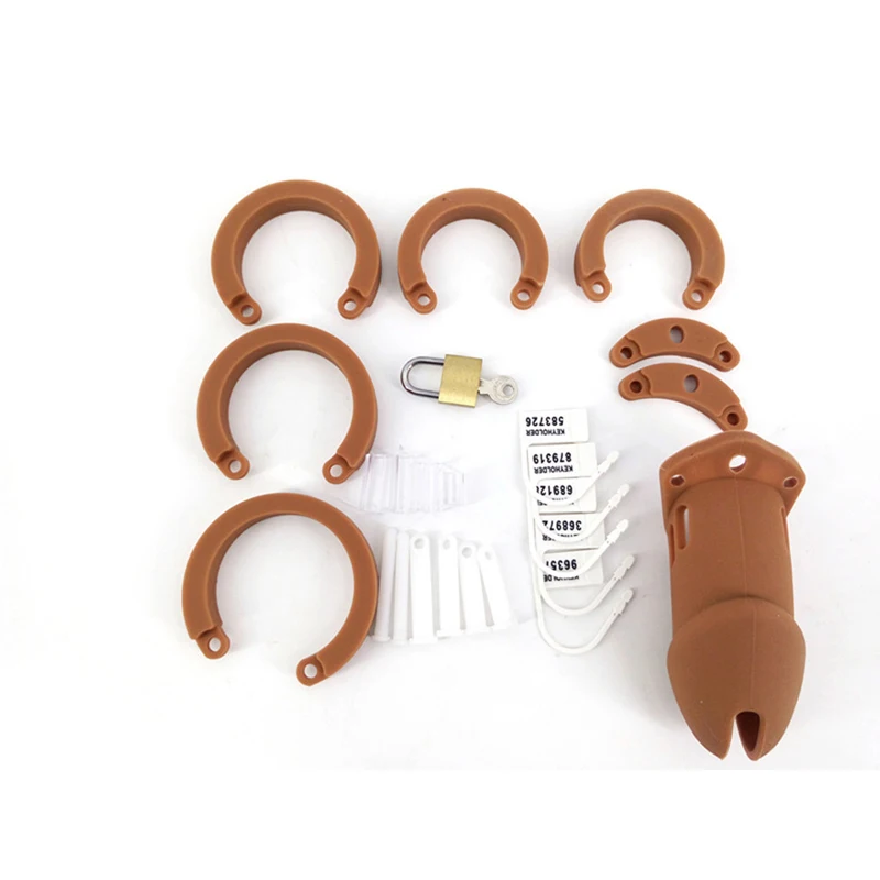 > 1. Тип изделия: Мужская клетка целомудрия> 2. Размеры: 10*3,8 см, короткие 8*3,8 см> 3. Цвет: черный, коричневый> 4. Материал: качественный мягкий силикон> 5. Вес: 150 г> 6. Особенность: кольцо для взрослых птиц, секс-игрушки для мужчин> 7. Упаковка: корпус Клетки + 5 различных размеров защелкивающиеся кольца (35/40/45/48/50/мм) + латунный замок и две клавиши + соединительные детали + 5 пластиковых одноразовых замков