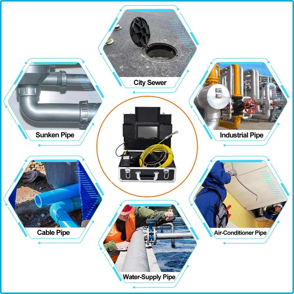 Этот продукт подходит для осмотра трубопроводов, канализации, воздуховодов, резервуаров, подводных и других темных условий, проверки внутренних трещин, коррозии, сварки, пробок и других необычных обстоятельств.