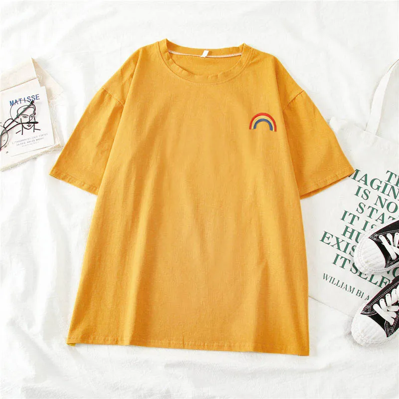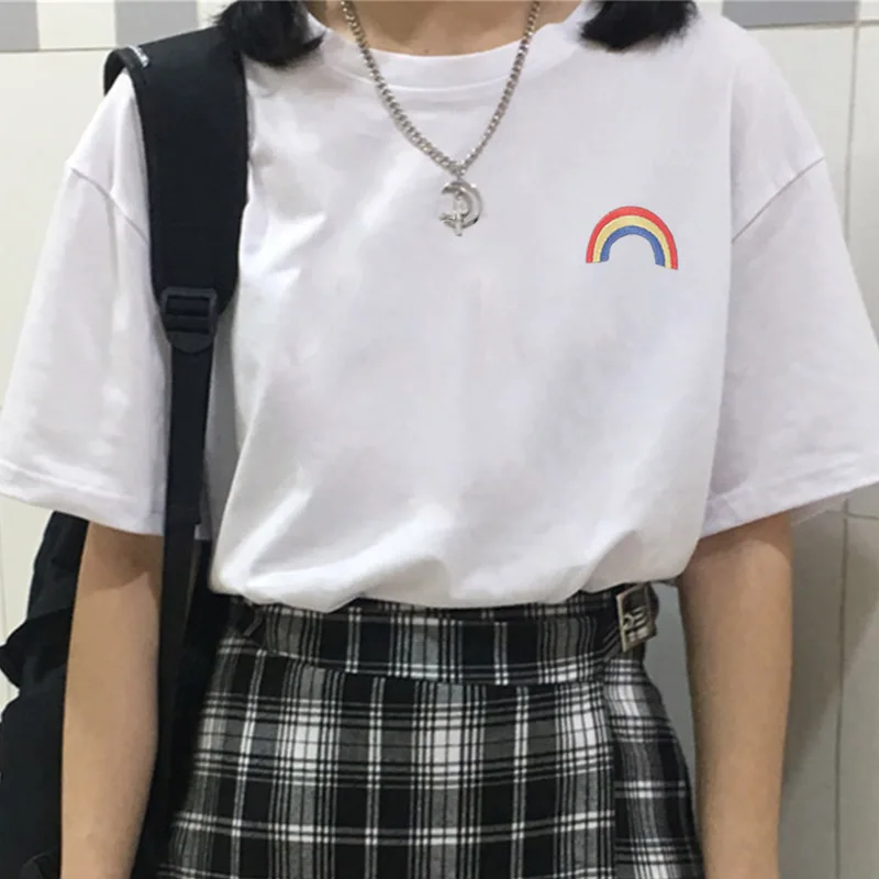 Футболка женская с вышивкой радуги, винтажный топ с круглым вырезом и коротким рукавом, свободного покроя, в стиле ольччан, Харадзюку, бойфренд, Готическая уличная одежда, лето