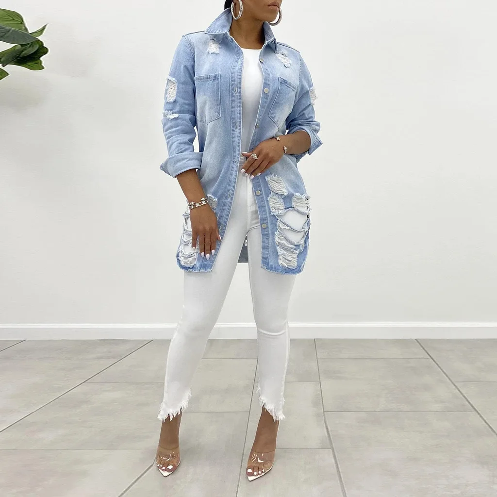 Уличной моды 2021 женские рваные джинсовые пальто однобортная джинсовая куртка модная женская верхняя одежда S-3XL