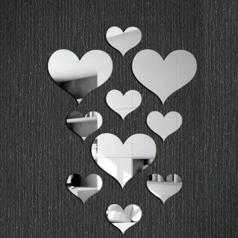 10 шт. 3D акриловые зеркальные настенные наклейки в форме сердца, пластиковые съемные декоративные настенные плакаты в форме сердца, декор для гостиной