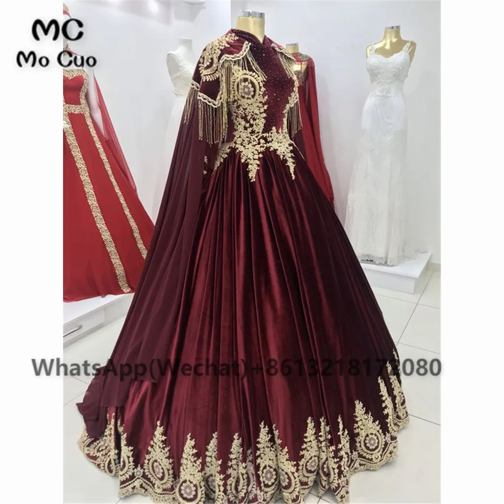 Арабское, мусульманское, 2021, Бордовое платье для выпускного вечера, длинные вышитые бисером нарукавники с разрезом, Золотая аппликация, кружевные платья для выпускного вечера, кисточки, алжирский наряд