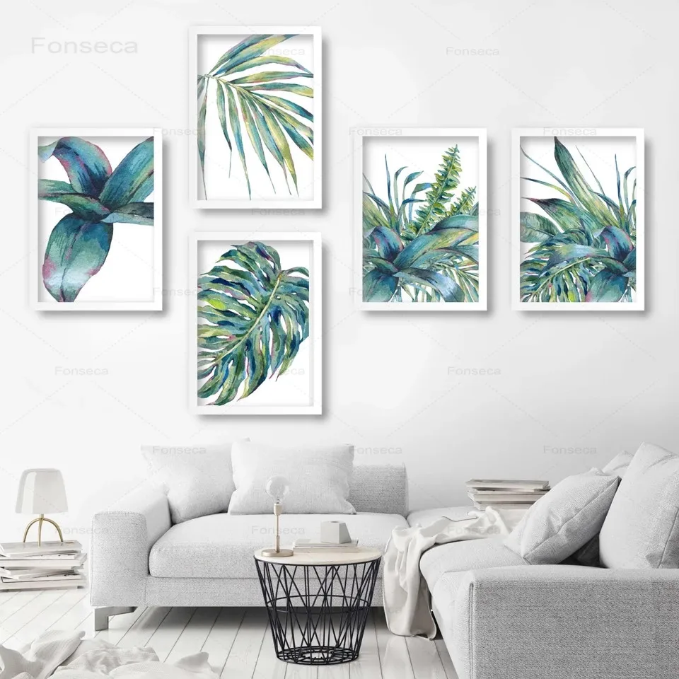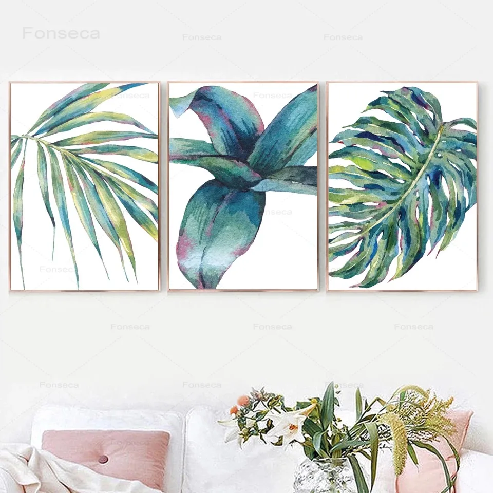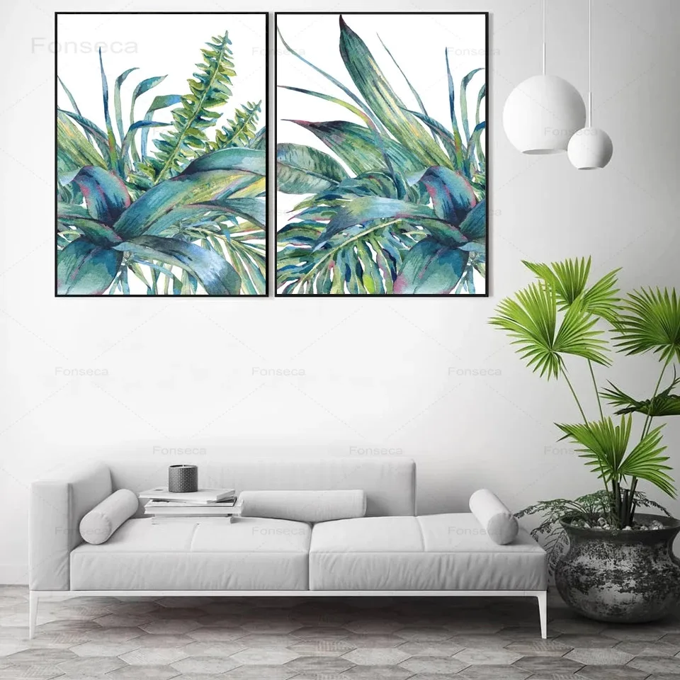 Тропические Пальмовые Листья на холсте, акварельные синие зеленые листья, галерея, искусство, ботанические настенные картины для гостиной, домашний декор