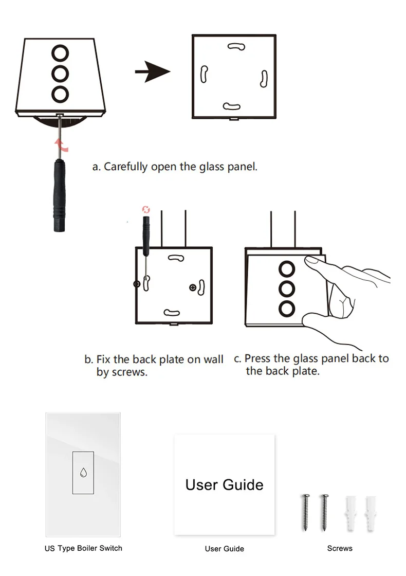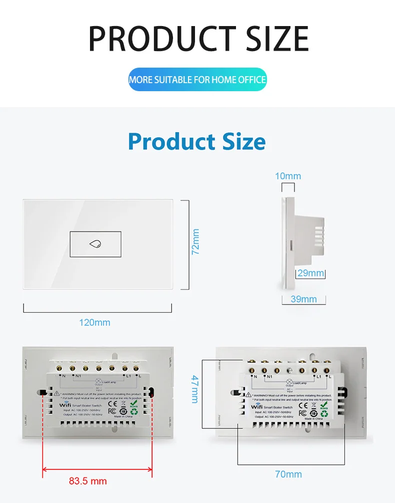1. Этот сенсорный Wi-Fi переключатель должен подключаться к нейтральной линии.2. Функция smart plug поддерживает только 2,4 ГГц беспроводной сети Wi-Fi, не поддерживает Wi-Fi 5 ГГц сети.3. Переключатель котла не регулирует температуру.
