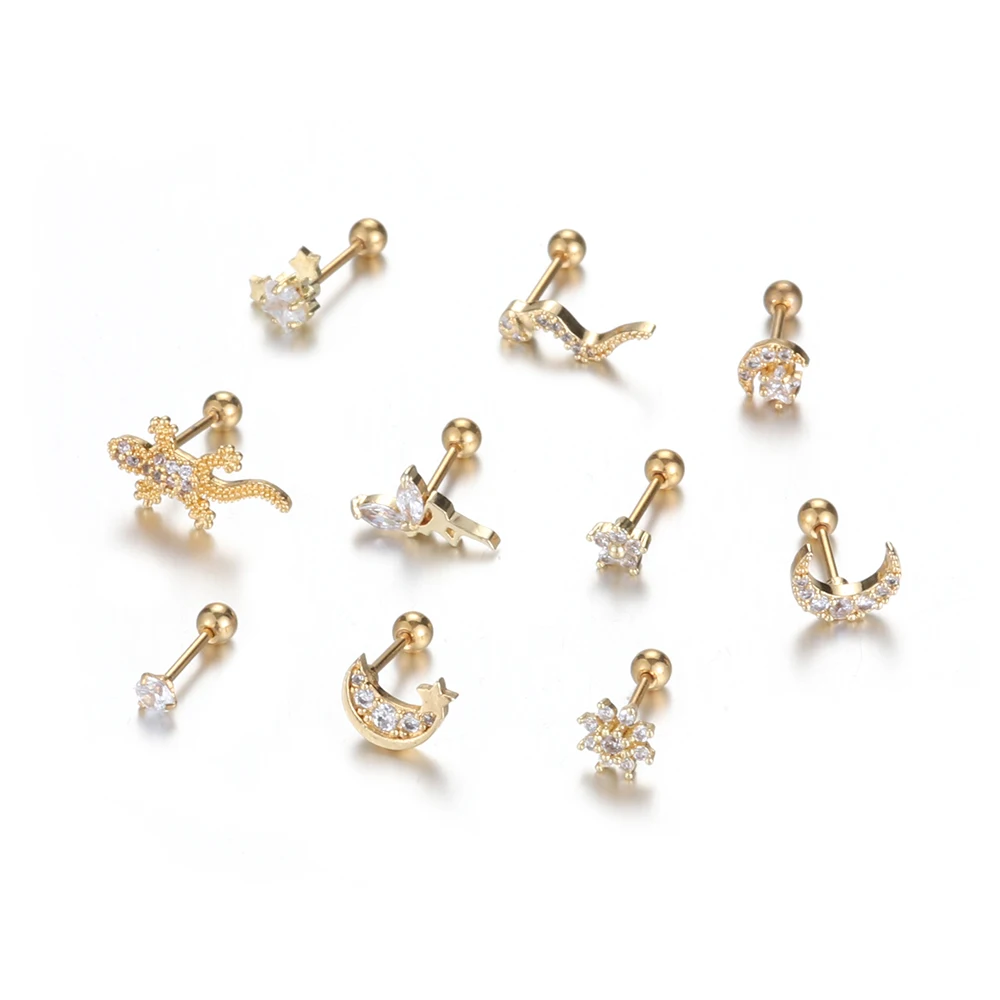 Серьга-гвоздик из нержавеющей стали с фианитом на спине, ювелирное изделие для пирсинга змеи, ящерицы, геккона, цветка, Луны, хряща, завитка ушной раковины, раковины