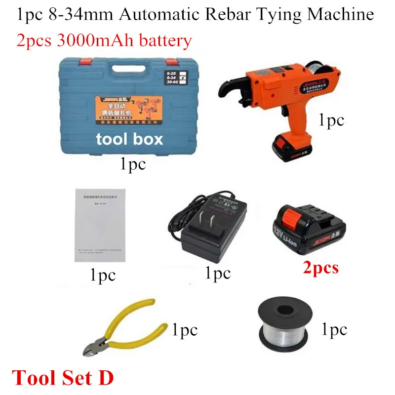 1 шт. ярус арматурыЛитиевый аккумулятор 3000 мАч, 2 шт.1 шт. проволочные ножницы1 шт железная проволокаЗарядное устройство 1 шт.1 шт. чемодан