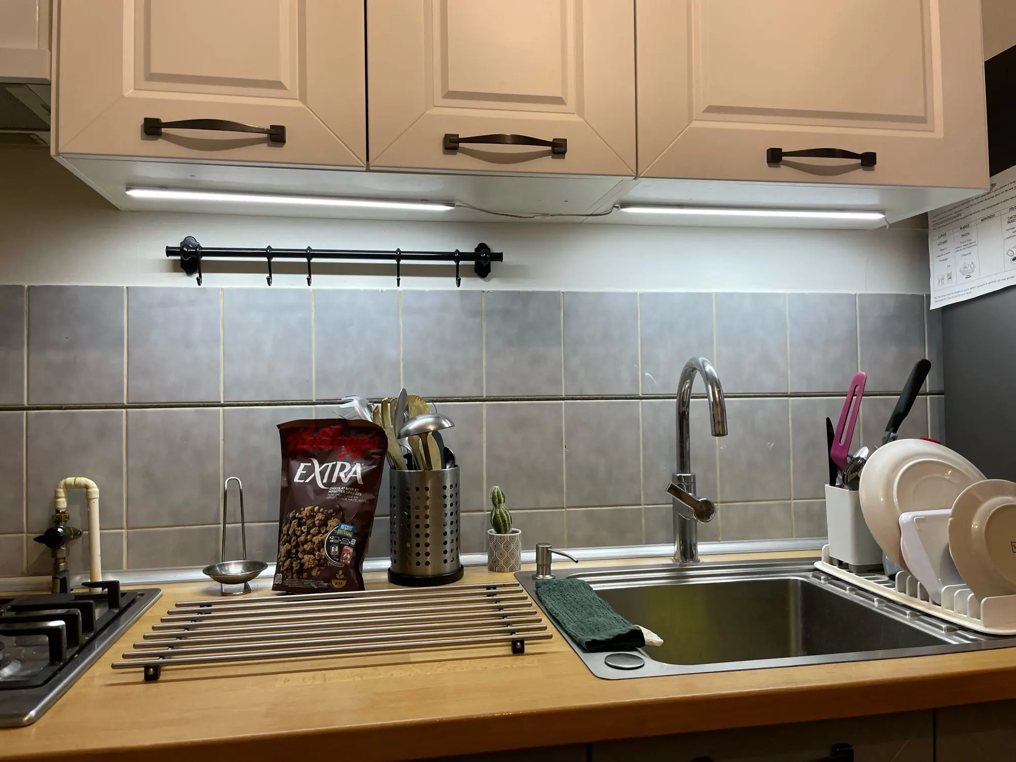 Хороший светильник, знал бы, заказал два, крепиться двухсторонними наклейками или же на саморезы, работает от сети, яркость регулируется, длина провода стандартная, чуть больше метра