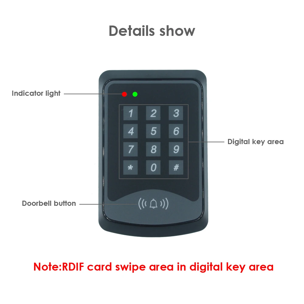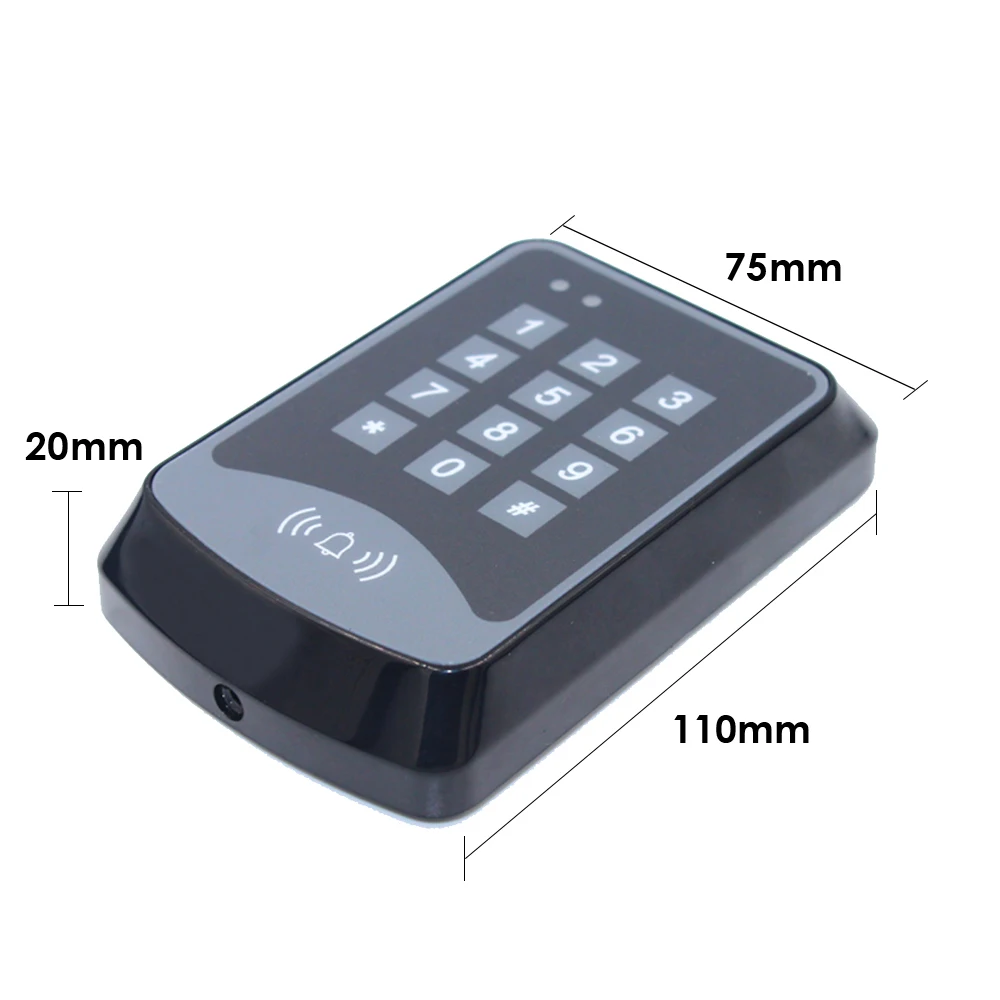Профессиональный дизайн и качество для дома и офиса, высокая безопасностьРабочее напряжение: 12 В постоянного токаЕмкость RFID-карты: 1000 пользовательских карт, «персональный контакт» идет отдельно с каждой картойВремя Реле блокировки: 3 секундыРасстояние считывания карт: 5-15 смТип RF-карты: совместимая карта EM или EMРабочая температура: -10 ~ 70 ℃Вариант дверного звонкаОпции открытия двери (выбор пользователя администратора): карта (ключевая бирка) и пароль/карта (ключевая бирка)/пароль вкл.