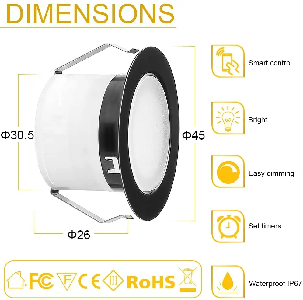 Цвета освещения: RGBWНапряжение: DC12VСкорость Выход Мощность: 1,2 Вт (RGB 0,5 W + теплый белый 0,7 W)Световой поток: теплый белый 12 лмУгол луча: 120 °Светодиодный чип: SMD 5050 (RGBW 4 в 1 светодиодный)Чипы: 3 шт.IP Рейтинг: IP67Применение: открытыйДлина провода: двойной 0,5 мСертификация: CE ROHSМатериал: Поликарбонат, высококачественная и нержавеющая стальДеменция: Φ45 * h26ммГарантия: 2 годаФункции: декоративный светильник