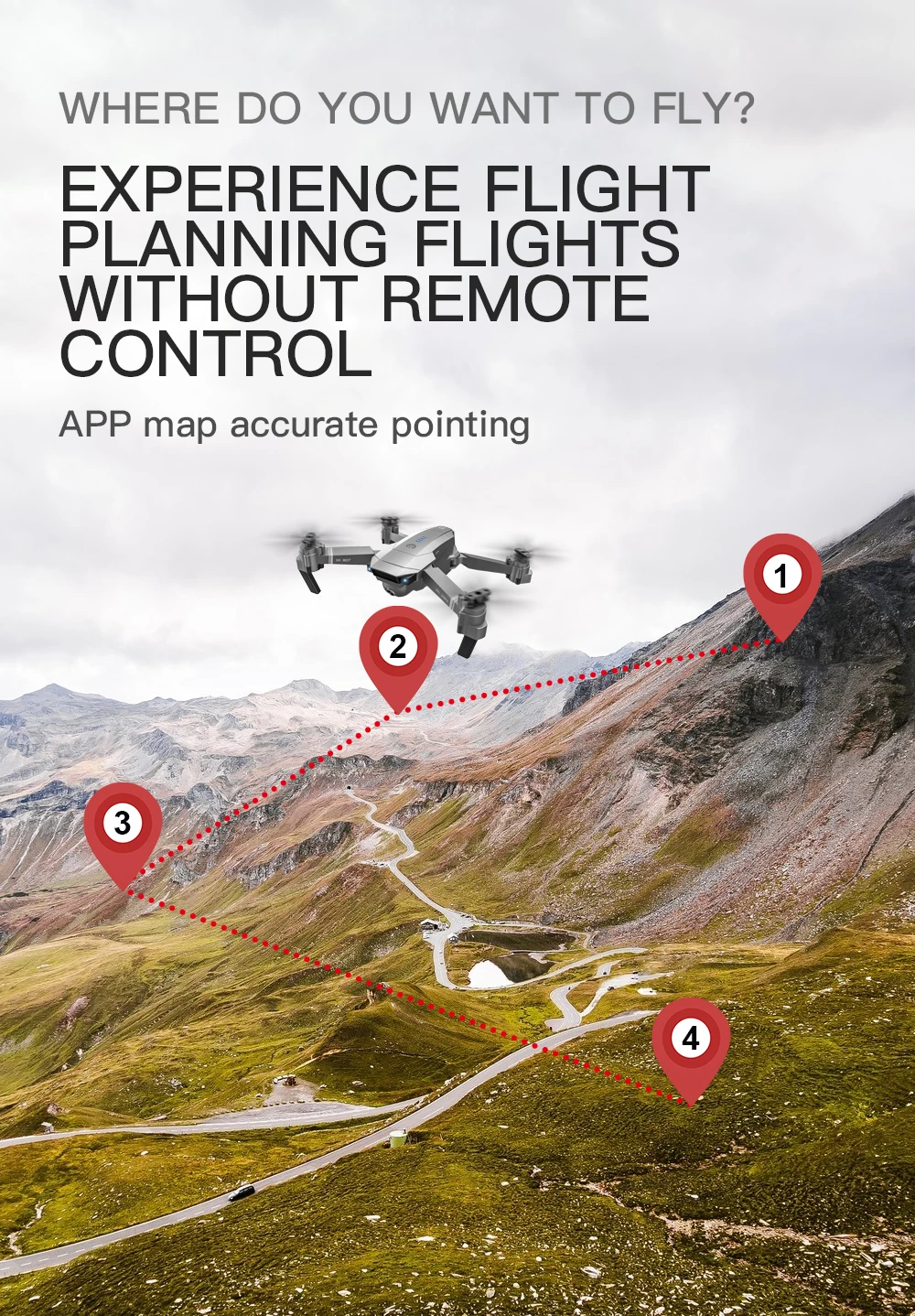 GPS возвращается в точку взлета с помощью одной кнопки, и низкая мощность возвращается в воздух, и нет сигнала на возврат. GPS Smart Follow: после того, как самолет подключается к GPS, функция приложения follow включена, и самолет следует за мобильный телефон. Изображение: 1-5 м от самолета для определения предмета и выполнения автоматического полета. Распознавание Жестов: в пределах 1-5 м от самолета, сделайте жесты камеры/жесты камеры к камере. Многоточечное планирование полета: самолет автономно летает по заданному маршруту, и игрок концентрируется на съемке. Окружность точки: Найдите центр и перемещайте желаемый радиус окружающего света с помощью джойстика. Функция восстановления самолета: непрерывно нажимайте значок gps-сигнала 3 раза, чтобы открыть интерфейс карты, карта показывает конечное расстояние самолета, широту и долготу. MV характеристики: фильтры, видеоэффекты, фоновая музыка, фото/видео обмен
