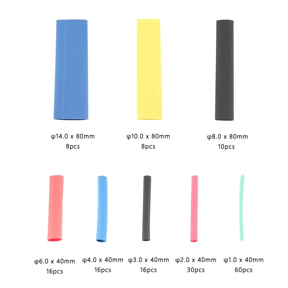 (Количество x внутренний диаметр x Одиночная длина) ● 60 шт. x 1,0 1,0x40 мм (желтый, черный, красный, зеленый) ● 30 шт. x 2,0 2,0x40 мм (желтый, черный, красный, синий) ● 16 шт. x 3,0 3,0x40 мм (желтый, черный, красный, зеленый) ● 16 шт. x 4,0 4,0x40 мм (желтый, черный, красный, синий) ● 16 шт. x 6,0 6,0x40 мм (желтый, черный, красный, зеленый) ● 10 шт. x 8,0 8,0x80 мм (желтый, черный, красный, синий) ● 8 шт. x 10,0 10,0x80 мм (желтый, черный, красный, зеленый) ● 8 шт. x 14.14,0x80 мм (желтый, черный, красный, синий)