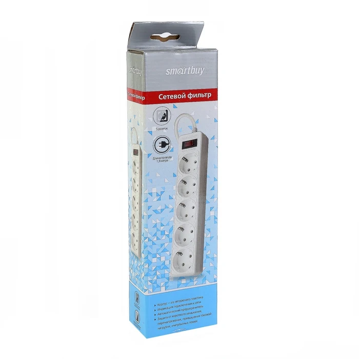 Сетевой фильтр Smartbuy One, 5 розеток, 1.8 м, 10 А, 2200 Вт, с зк, с выкл., белый 2799958