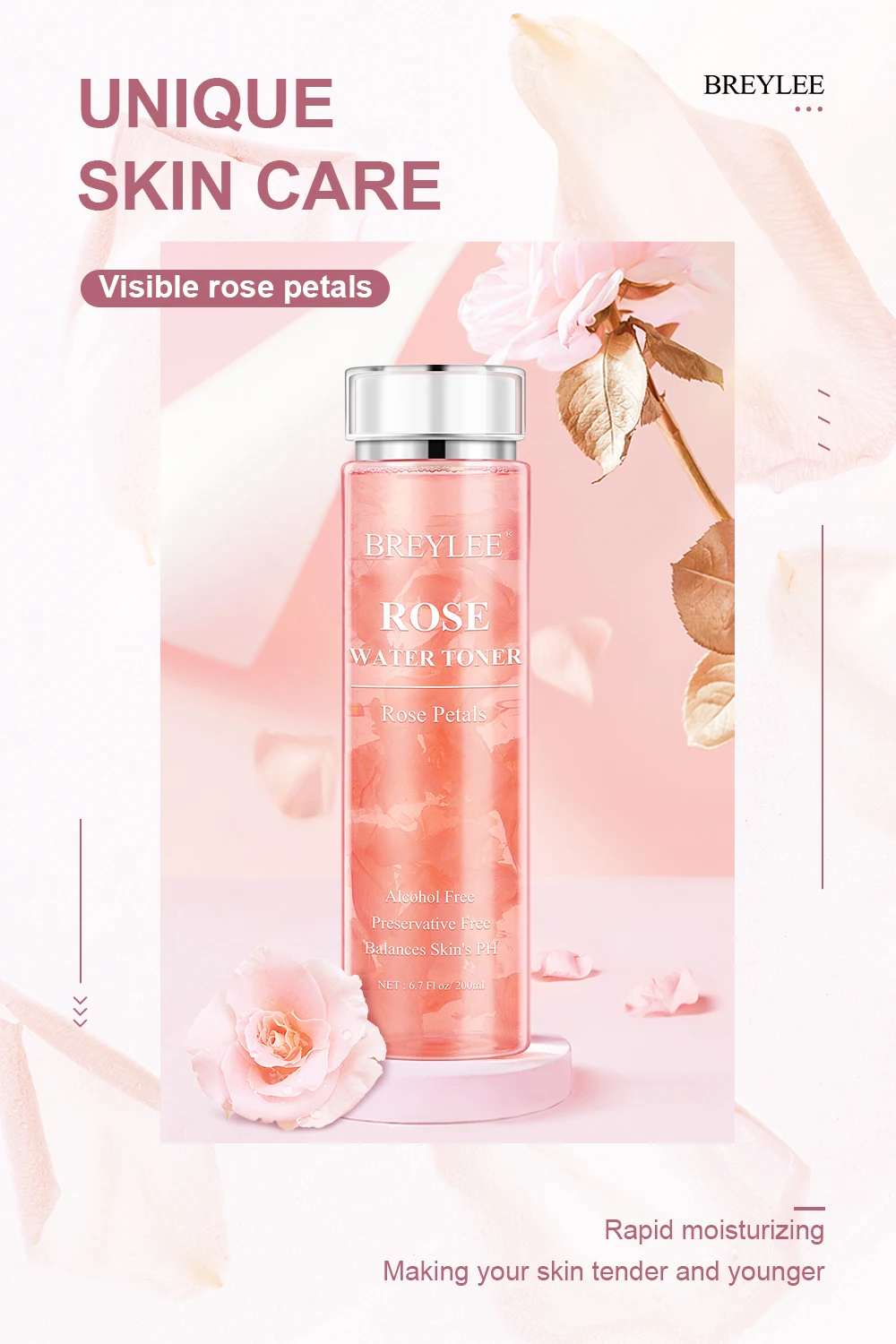 Дистилляция и извлечение лепестков розДрагоценная эссенция извлекается, чтобы сделать продукт с эссенцией цветкаНикотинамидОн может отбелить вашу кожу, улучшая темную кожу для гладких и водяных условийГиалуроновая кислотаОн может защитить ваш роговой слой, полностью увлажняя вашу кожуВидимые лепестки розОт свежих роз до увлажняющего ухода за кожейРемонт-лепестки роз плавят для питания эфирного масла в глубинеГладкость-видимая тонкая кожа такая же мягкая, как лепестки розВодо-тщательное увлажнение с гиалуроновой кислотой для лучшей влажности кожи
