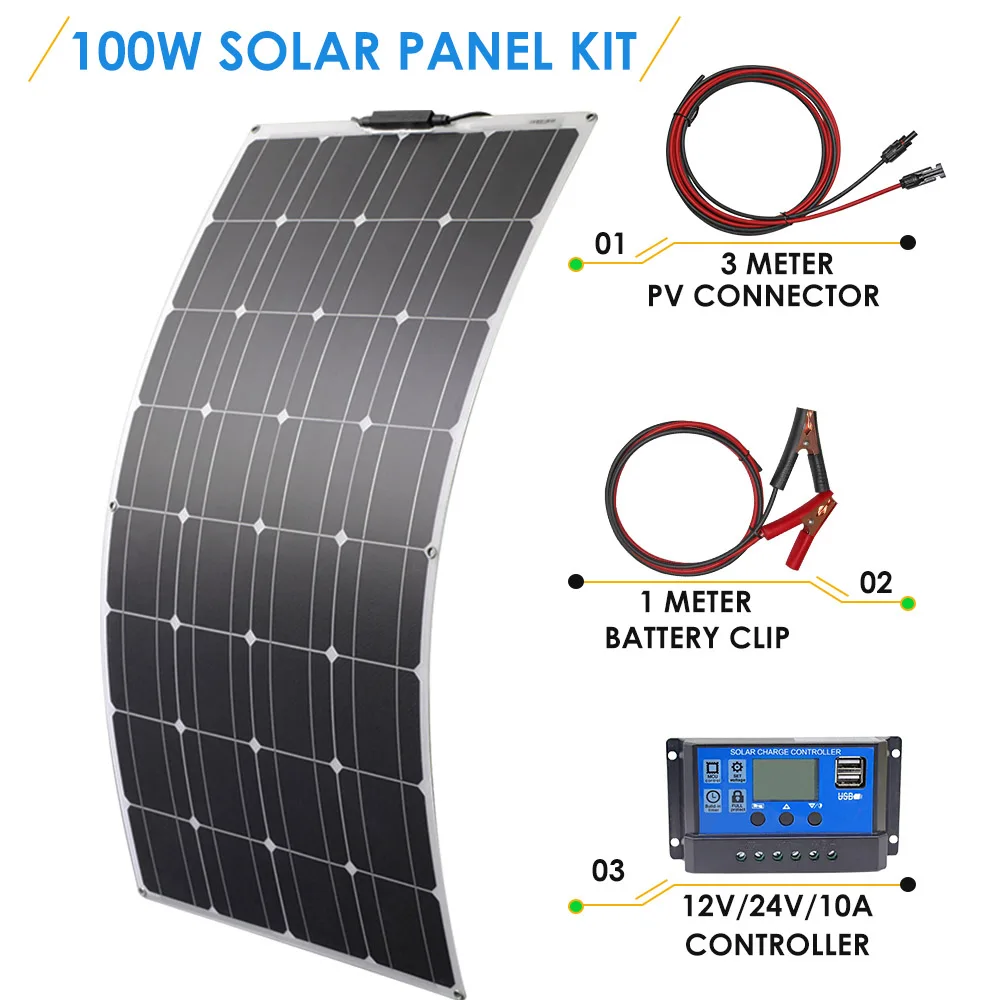 Список E: 100 Вт Солнечный комплект▶100W 16V солнечная панель * 1▶10A 12V/24V солнечный регулятор зарядное устройство * 1▶Кабель 39,37 "с зажимами типа крокодил * 1▶118,11 ”Удлинительный кабель * 1
