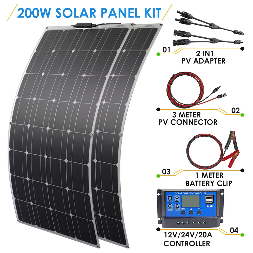 Список F: набор солнечных батарей 200 Вт▶100W 16V Панель солнечных батарей * 2▶20A 12V/24V солнечный регулятор зарядное устройство * 1▶2-в-1 PV адаптер * 1▶Кабель 39,37 "с зажимами типа крокодил * 1▶118,11 ”Удлинительный кабель * 1