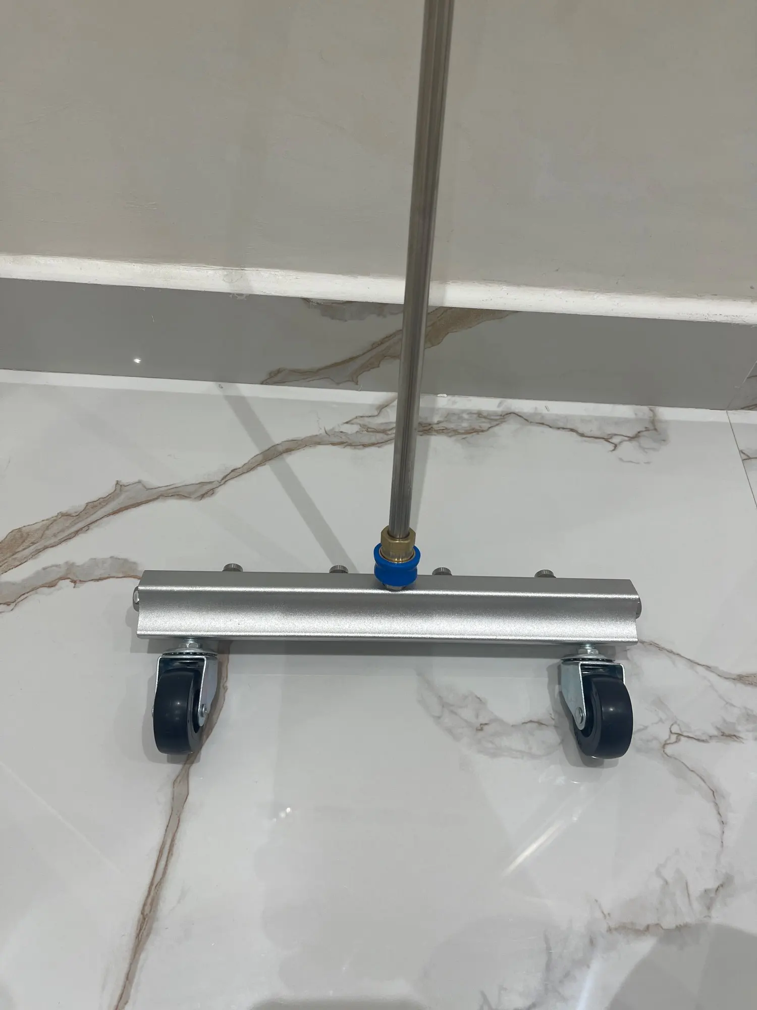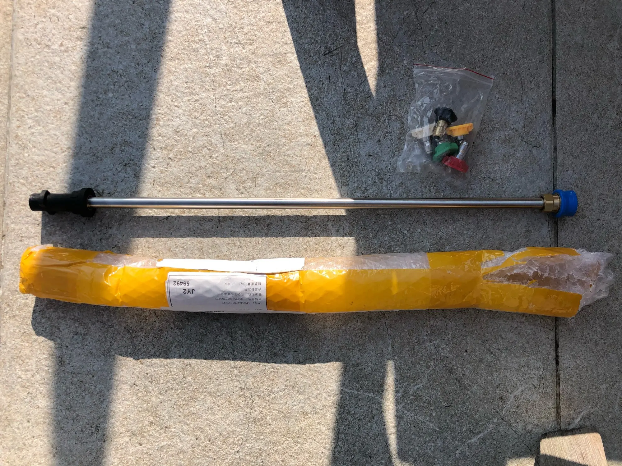 The item arrived today. Finally I was able to use it because the stick was already here for an few days. I took my Kärcher pressure washer and connected it to it. The result was disappointing. The connection is loose and goes from left to right. And the pressure over the 7 holes is gone so that only sand blows away. Any stains on the tiles won’t be removed by this water broom. Disappointing:-(