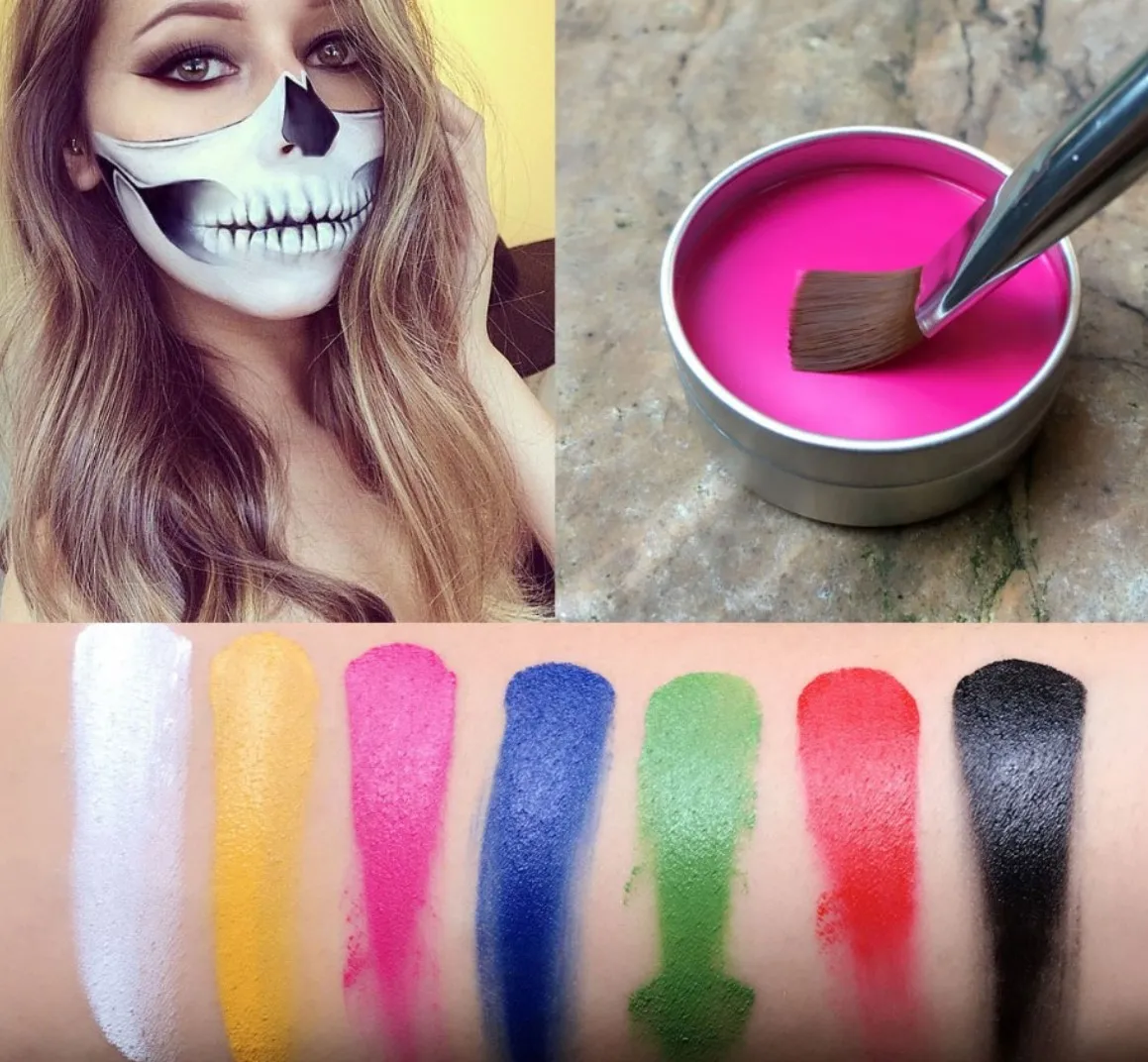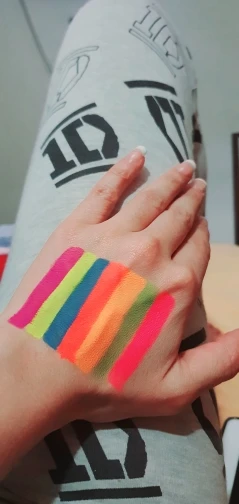 Он отлично работает, действительно загорается под УФ-светом. Оранжевый и розовый цвета наиболее заметны. Используйте немного воды, а затем нанесите. Легко снимается при чистке водой.