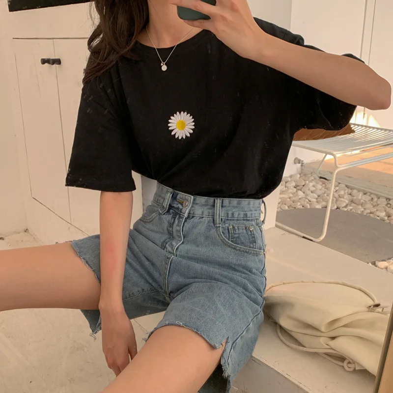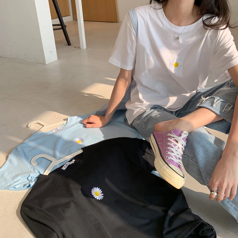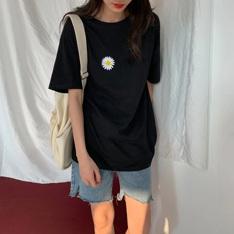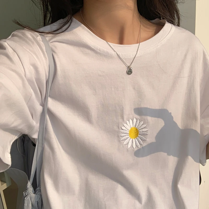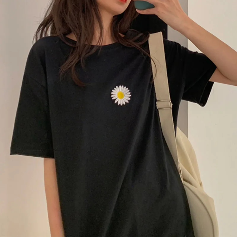 Футболка женская с вышивкой ромашки, простой Свободный Топ с коротким рукавом, милая футболка в стиле Харадзюку для девушек, эстетичная оверсайз, на лето