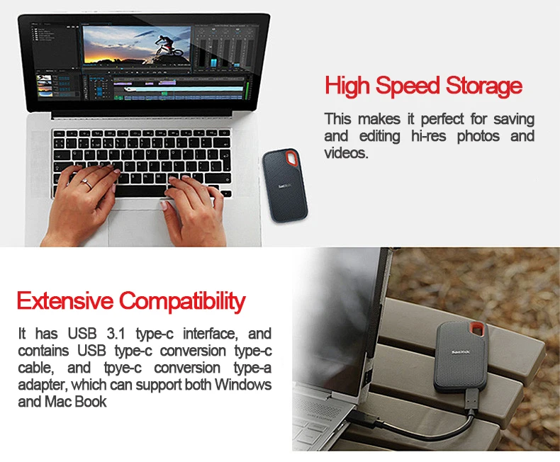 Предназначен для работы с Windows и Mac, sanDisk Extreme Portable SSD Оснащен разъемом USB 3,1 Type-C, а также включает кабель USB Type-C-Type-C и адаптер Type-C-Type-a, означает, что он будет работать с компьютерами и Mac сегодня, завтра и вчера.