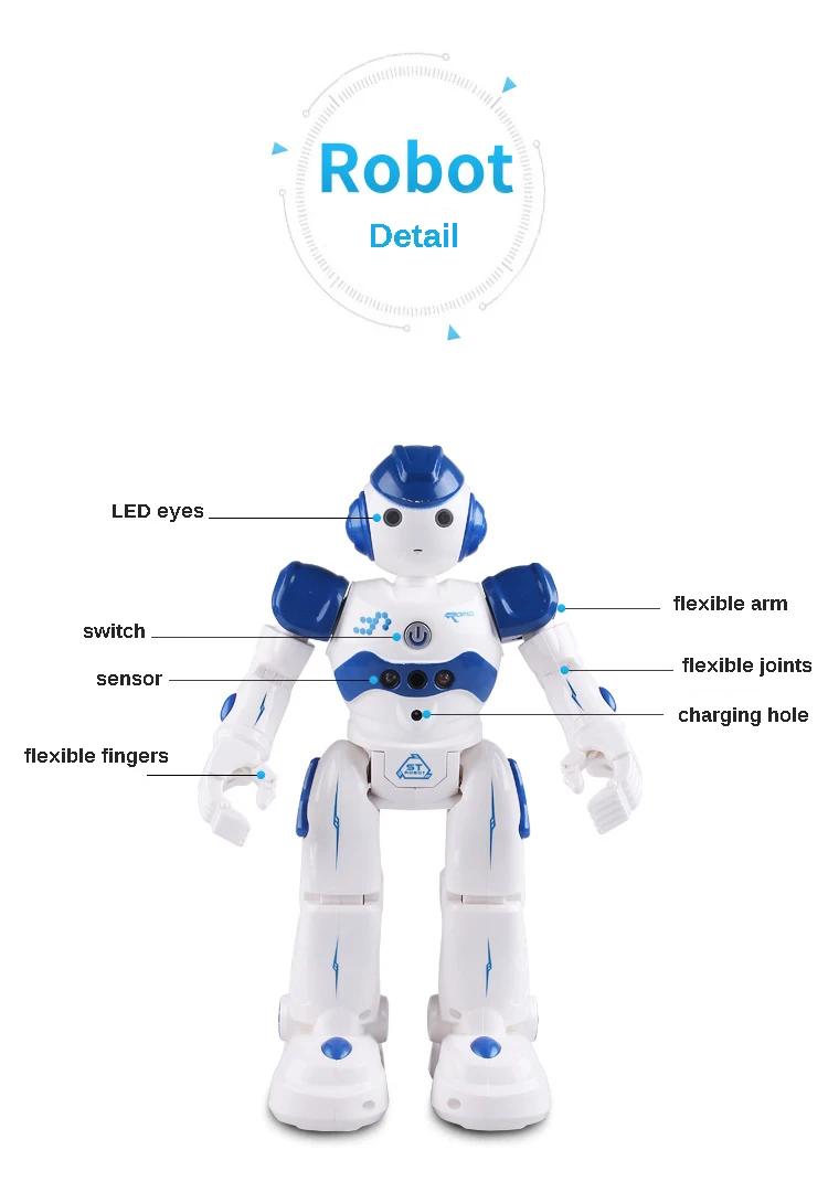 Функции: ходьба, горка, танцы, пение, программирование, демонстрация одной кнопкой, распознавание жестов, крутой светильник