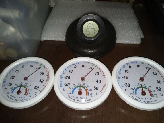 Товар получил. Претензий к точности показаний нет, подставки только плохо держатся, но их можно просто приклеить. Показания́ у всех приборов одинаковые. Занижают температуру примерно на 0.5-1 градус, а влажность занижают примерно на 5 процентов относительно образцового прибора, но можно подстроить показания, сзади есть регулировочные винты. В общем покупкой доволен. Рекомендую товар и продавца