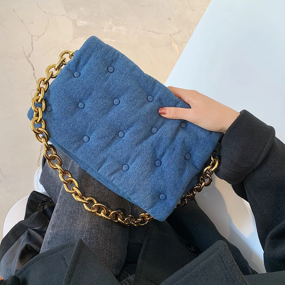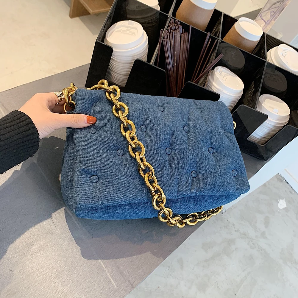 Дизайнерская Женская джинсовая сумка 2021, Золотая сумка на толстой цепочке, Женская Ковбойская мягкая сумка через плечо