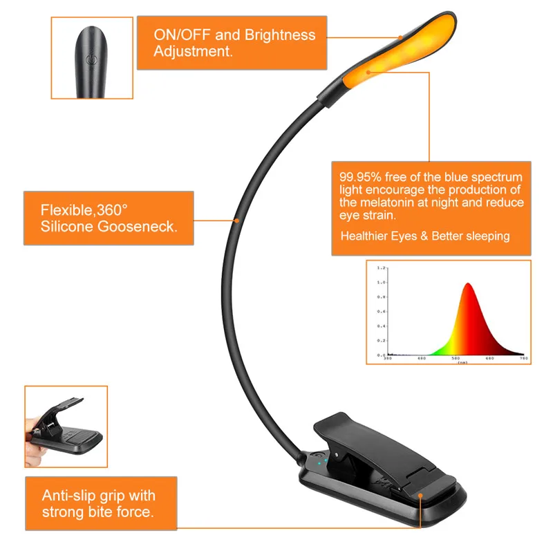 【Гибкая горловина и сверхмощный клип】-светильник на зажиме с вращением на 360 °, можно отрегулировать в любое положение, дать вам много светильник, где бы вы ни находились. Противоскользящая накладка на зажиме обеспечивает лучшую фиксацию и защищает страницы или мебель от повреждений, которые могут быть закреплены на головных платах, ноутбуках, книгах, Kindle и т. д.