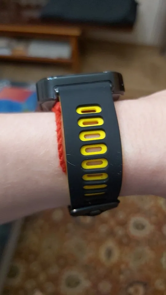 На фото он выглядит немного серым, но черный с желтым. Это удобно, оно не жесткое и не толстое, поэтому хорошо вписывается в запястье. Хорошая покупка.