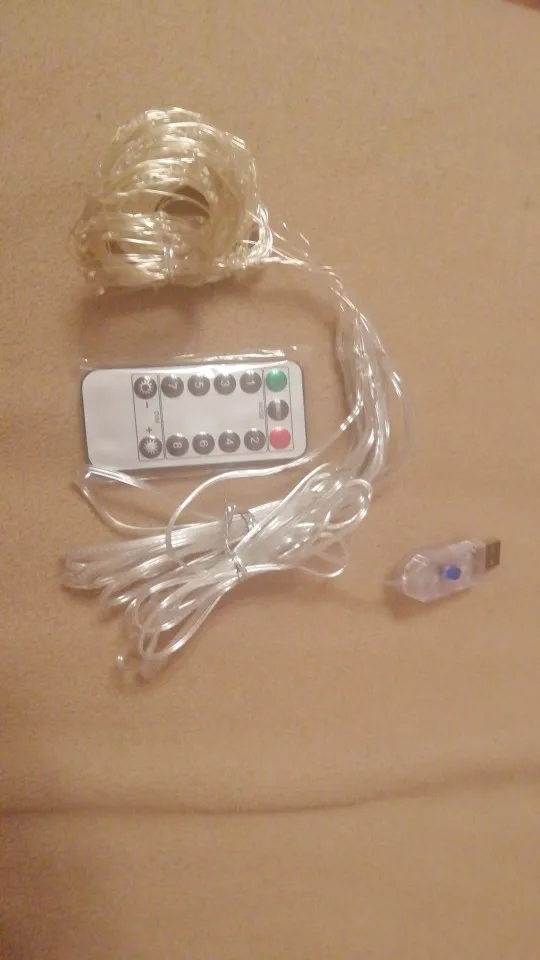 Я очень доволен своей покупкой. Гирлянды сделаны из железа и свернуты, их нужно отсоединить один за другим, а затем потянуть аккуратно, и это будет образовать спираль, мы можем оставить их такими же, как они, или вернуть провод, чтобы это было правильно... Есть несколько режимов мигания и степени яркости, которые можно регулировать на пульте дистанционного управления и/или на usb-разъеме. Я спросил себя, как оставаться на режиме, потому что он меняется и становится раздражающим, когда он мигает во всех направлениях. Мне не удалось настроить его на пульт дистанционного управления, и я нажал кнопку разъема usb, и что-то было отрегулировано, он остается в режиме, который я выбрал. Чтобы увидеть вовремя, но все равно кажется довольно хрупким. Хорошее соотношение цены и качества
