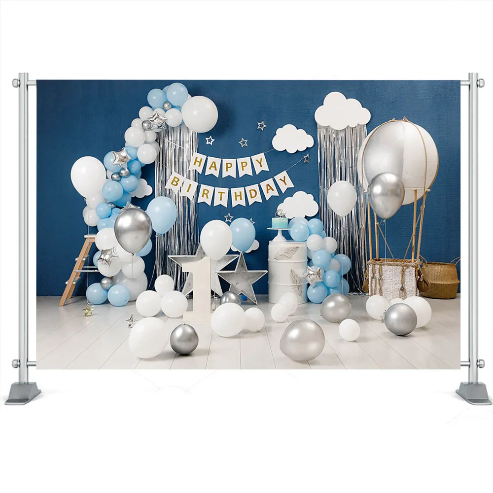 Фон для фотосъемки мальчиков на 1-й день рождения с изображением торта и голубых воздушных шаров с изображением белых облаков