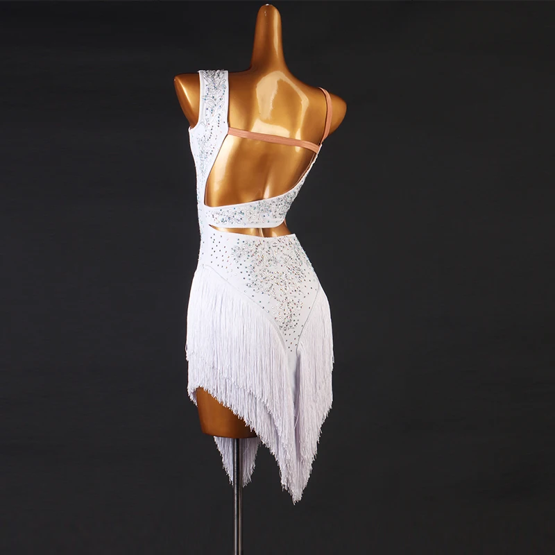 Латинские танцевальные платья для танцев для женщин пикантные белые стразы с бахромой без рукавов, одежда для представлений, Румба практика костюм DQL4759