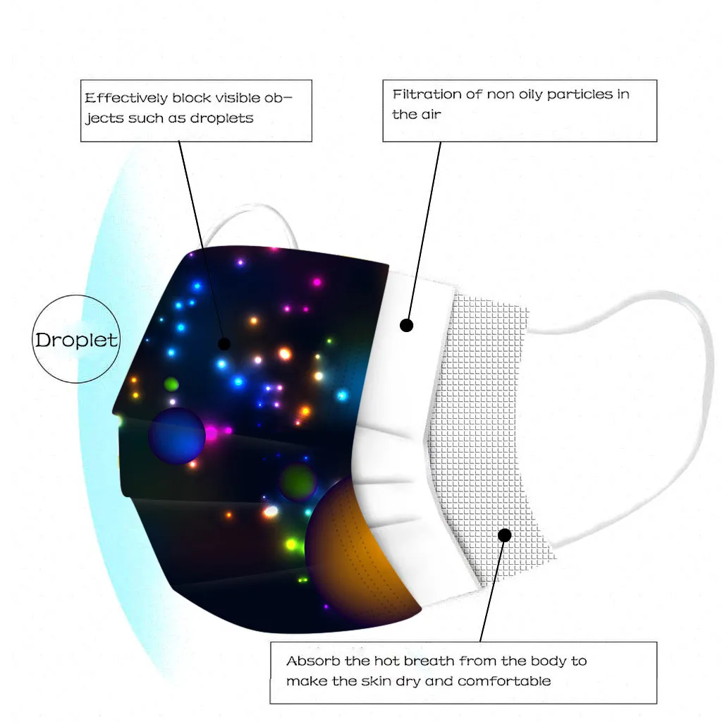 В 3 слоя Нетканая одноразовая маска изготовлена из 3 слоев нетканого материала, Безопасен и безопасен для использования. Дышащий материал и милый Узоры, которые делают его полезным и модным. Специальный 3 слоя из нетканого материала Дизайн, обеспечивает некоторую защиту от пыли, автомобильных выхлопных газов, Пыльца и т. д. эластичная Ушная петля, легко носить и не давит на уши. Маникюрный салон или любые другие области, где может потребоваться защита