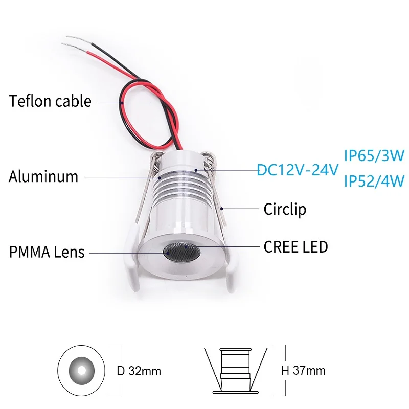 Бренд: etrnLEDНазвание: 3 Вт/4 Вт DC12V мини пятна садовые огниМодель: MINI23C-4W/MINI60C-3W водонепроницаемый прожекторЧипы: 3 Вт/4 Вт CREE светодиодныйДиммируемая: Поддержка PWM затемненияВход напряжение: 12V-24VСветильник Материал корпуса: алюминийЦветовая температура: WW(2700-3000K), W(4000-4500K), CW(5500-6500K)Длина кабеля: 170 мм тефлоновый кабельКласс защиты: IP52/IP65Световой поток: 320-400лмCRI: >80RaРазмеры: D32 × H37 мм, d25 мм отверстия для резкиСтепень рассеивания света: 30 °Установка: встраиваемый точечный светодиодСрок службы: 50000 чГарантия: 5 летСертификация: CE RoHSПрименение: потолок, спальня, кухня, гостиная, витрина, шкаф, книжный шкаф, винный шкаф, лестница, вход, коридор, автомобили, бар, KTV, ресторан, Звездные огни, или что вы можете себе представить!