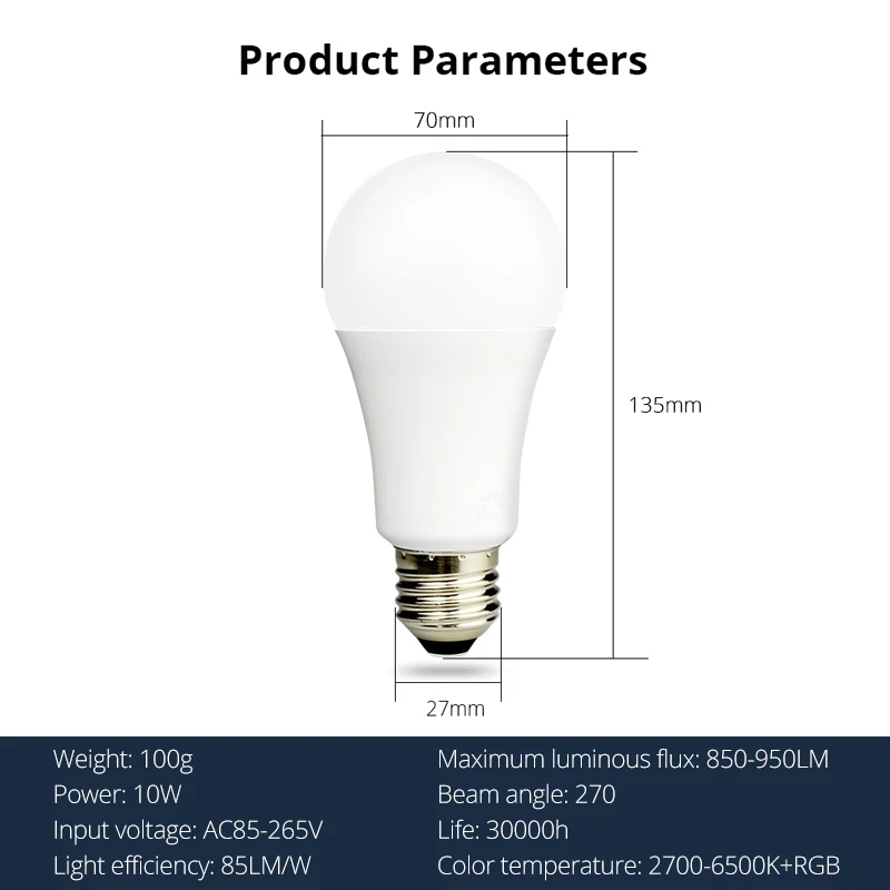 -Цвет изделия: белый -Функция: управление Zigbee, Совместимость с Amazon Alexa Echo Google Home Assistant -Светильник Цвет: RGBCW -Цветовая температура: 2700-6500K -Тип цоколя: E27 -Мощность: 10 Вт -Напряжение: 85-265 В переменного тока -CRI: >80 -Светоотдача: 85 лм/Вт -Световой поток: 850-950LM -Срок службы: 30000 ч -Угол луча: 270 ° -Размер: 70*135 мм -Вес нетто: 100 г