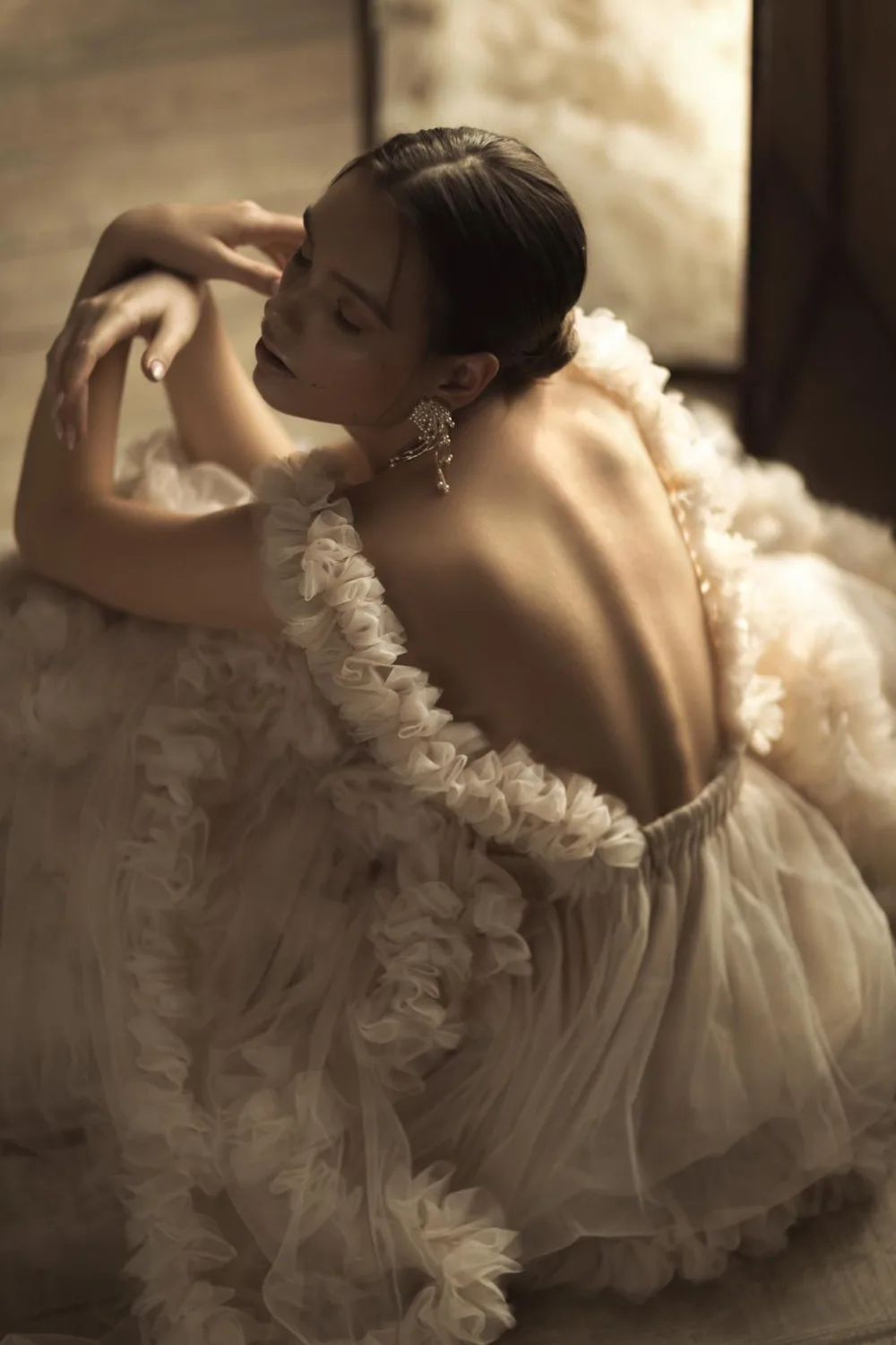 Тюлевое платье без рукавов, с глубоким V-образным вырезом и оборкам...