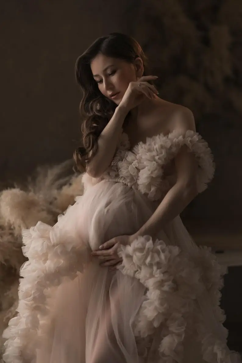 Длинное платье для беременных, Тюлевое платье с оборками для фотосессии или вечеринки, Драпированное, размера плюс