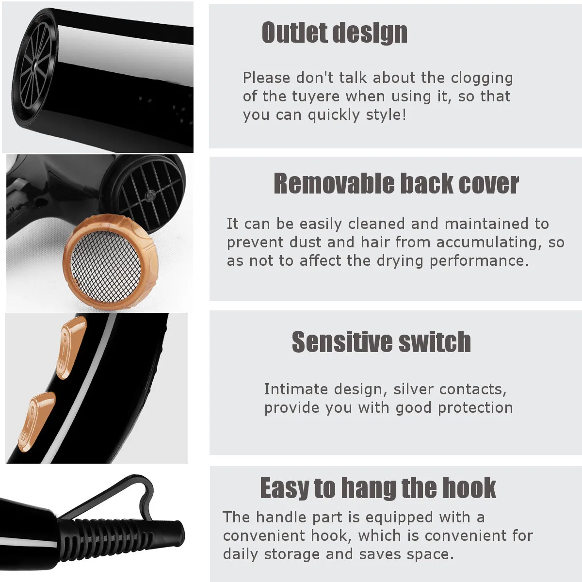 Съемная задняя крышка, ее можно легко очистить и поддерживать, чтобы предотвратить накопление пыли и волос, чтобы не повлиять на производительность сушки.