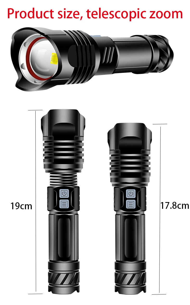 Модель: Тактический светодиодный Светильник источник: XHP50 (1 см; Размеры 9-сердечник фитиль) Диапазон: 600-1000 метров Цвет: черный Режим: 100%-75%-50%-вспышка-SOS Размер: 17,8*4,8*3,5 см Источник питания: 1*26650 Вес: 268 г Светильник Время работы: 26650 аккумулятор: 3-4 часа (сильный светильник) Время зарядки: 3-5 часов Метод зарядки: Прямая зарядка через USB Водонепроницаемый IPX-6 Материал: авиационный алюминиевый сплав Назначение: кемпинг для пеших прогулок, строительство альпинистского патруля, прогулочные дома