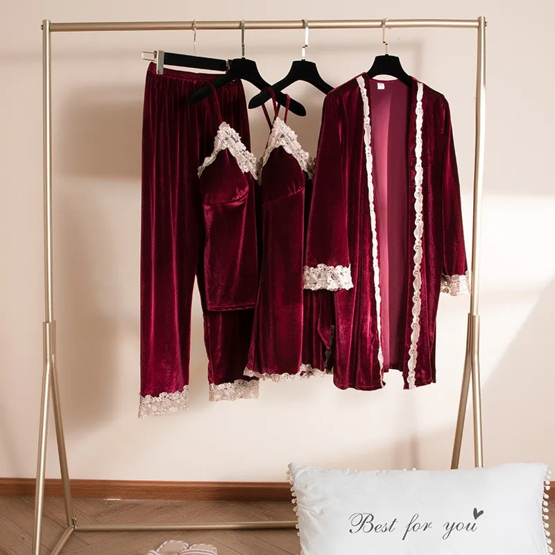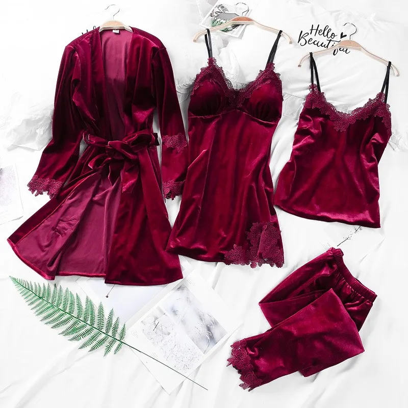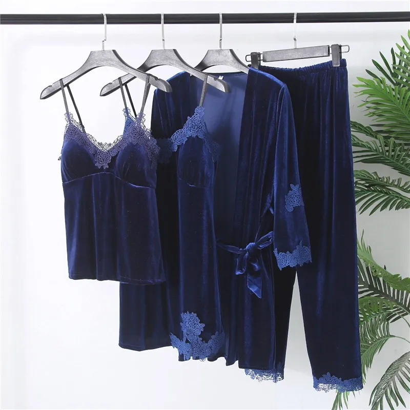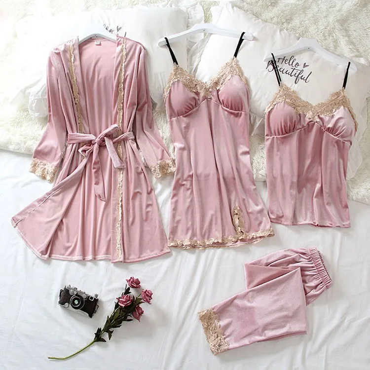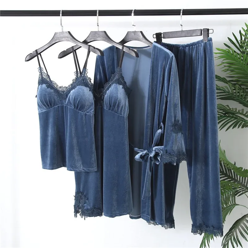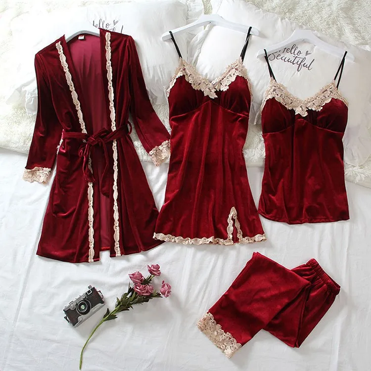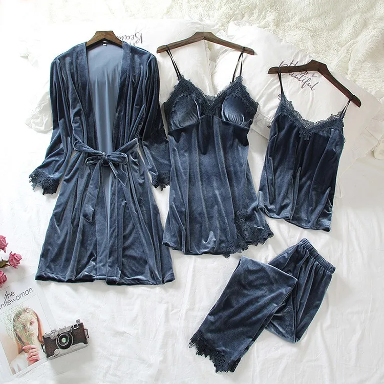 Халат-кимоно Женский, мягкая велюровая Пижама, повседневный кружевной банный халат, бархатная Пижама, интимное нижнее белье, 4 предмета