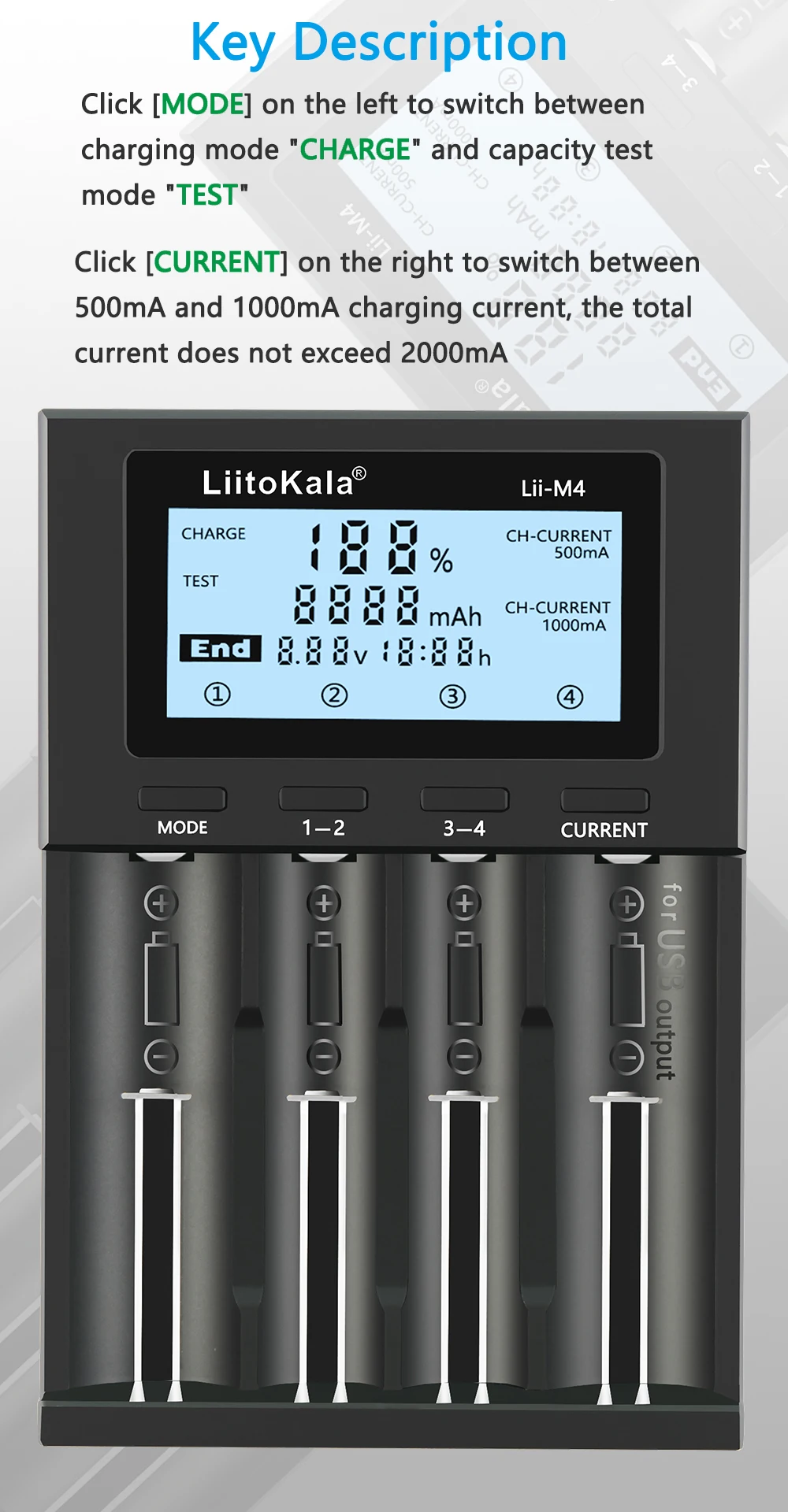 Спасибо за использование нашей компании зарядное устройство продуктов-Lii-M4, это высококлассное умное быстрое зарядное устройство, С ключ/4 канала независимый перезаряжаемый аккумулятор емкостью тестирования/метр/Защита от короткого замыкания, защита от перезарядки/5 v1a напряжение на выходе USB и ноль вольт батарея Функция активации характеристики, И может автоматически контролировать заряд батареи, разрядку и процесс тестирования.