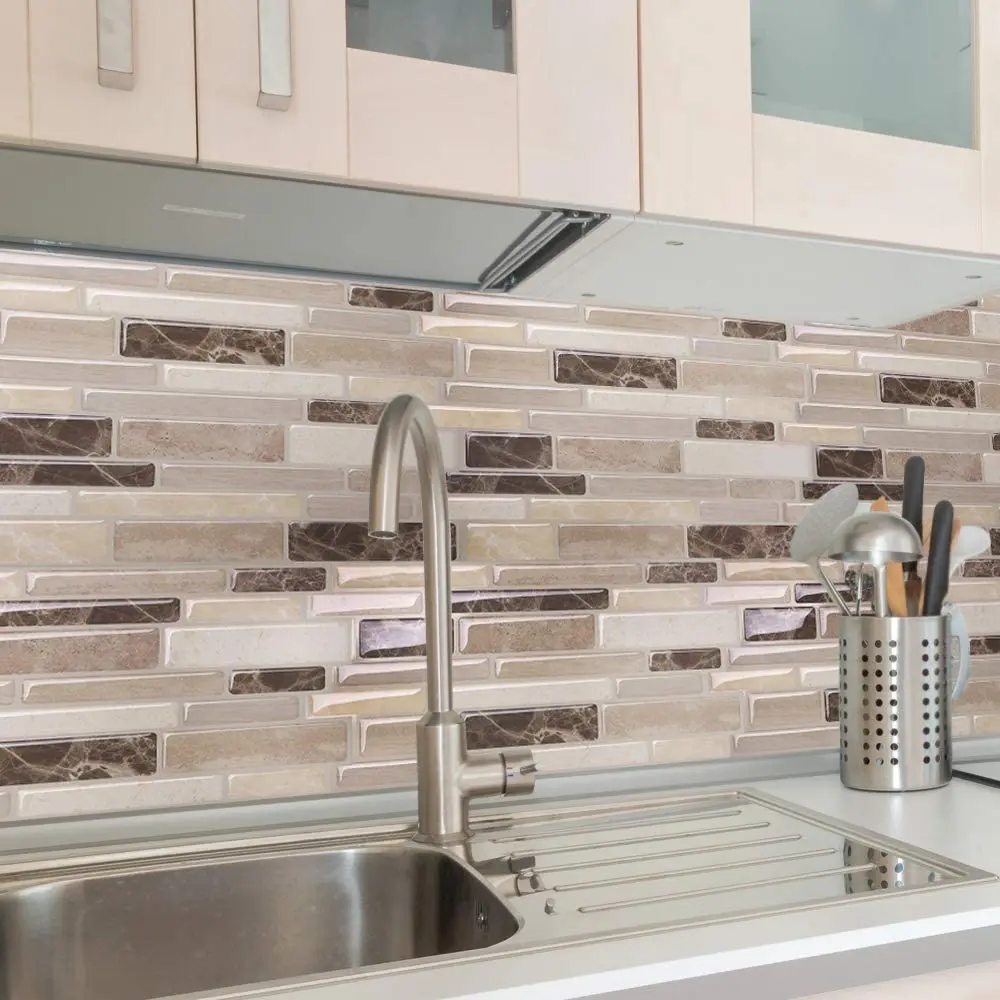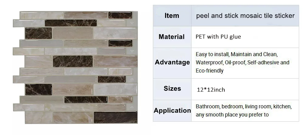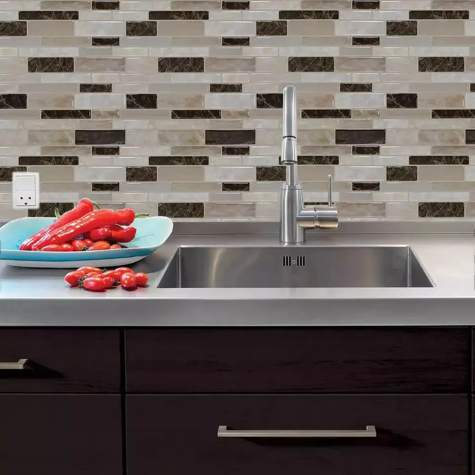 Плитку можно легко установить поверх существующих панелей или на гладкую поверхность. Специально разработана для кухонных брызг и брызг ванной, плитка устойчива к жару от плиты и влаге от ванных комнат.