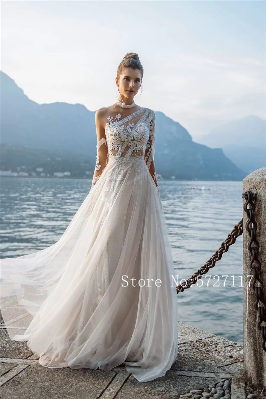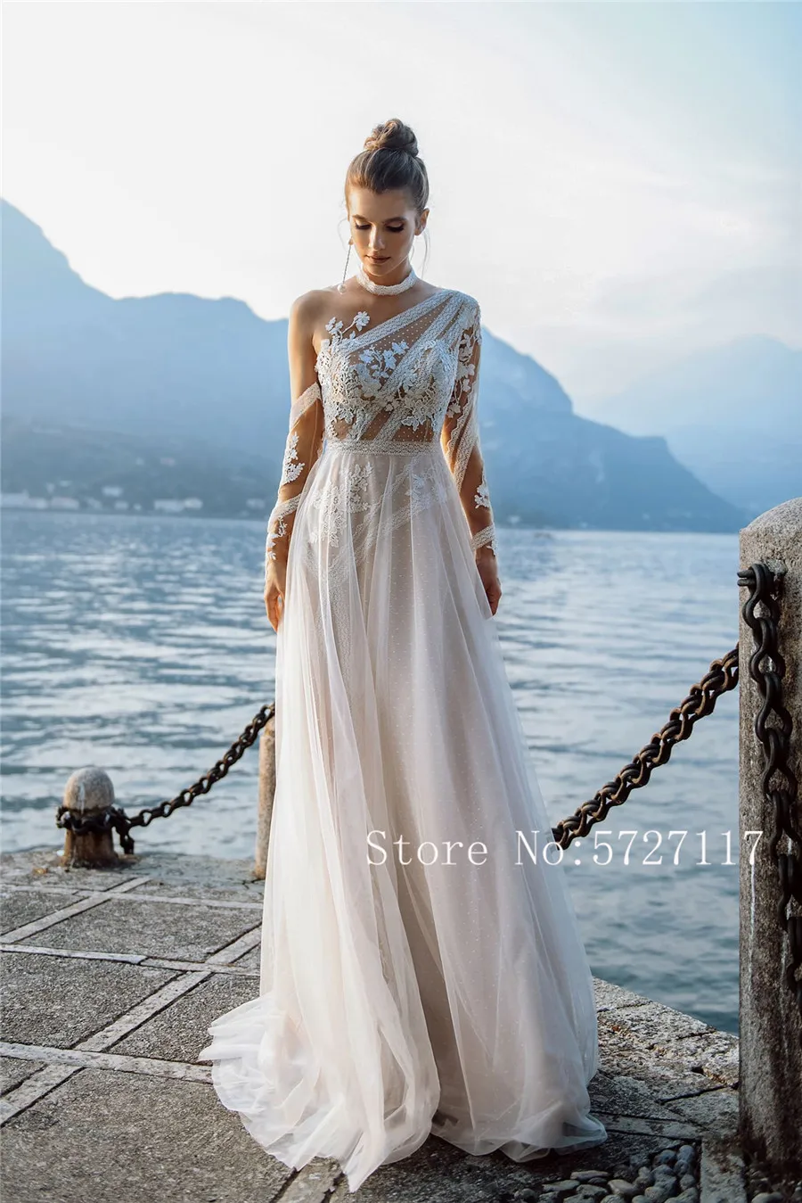Одно плечо асимметрия, с кружевными аппликациями, телесного цвета свадебное богемное платье Стиль пляжные с длинным рукавом Свадебное платье vestido de fiesta de boda