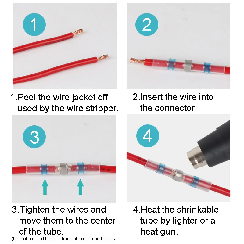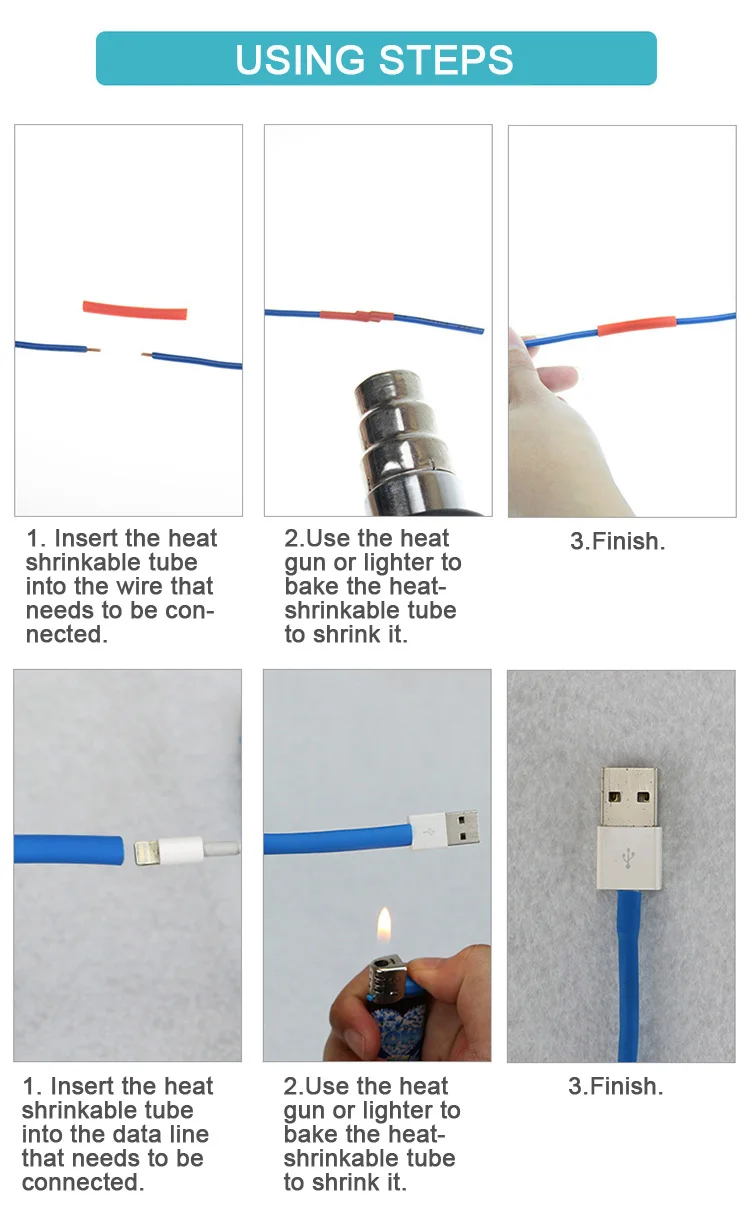 1. Вставьте термоусадочную трубку в провод, который необходимо подключить.2. Используйте тепловой пистолет или зажигалку, чтобы испечь Термоусаживаемую трубку, чтобы уменьшить ее.3. Отделка.