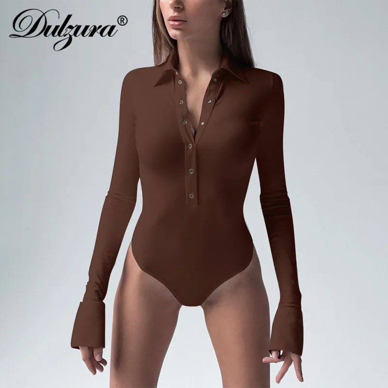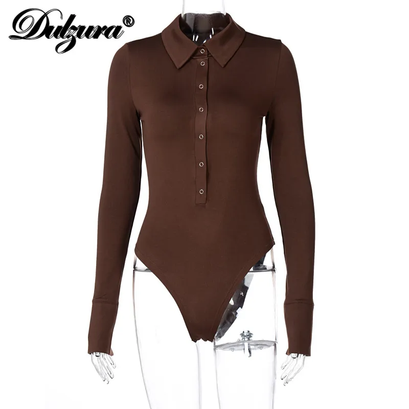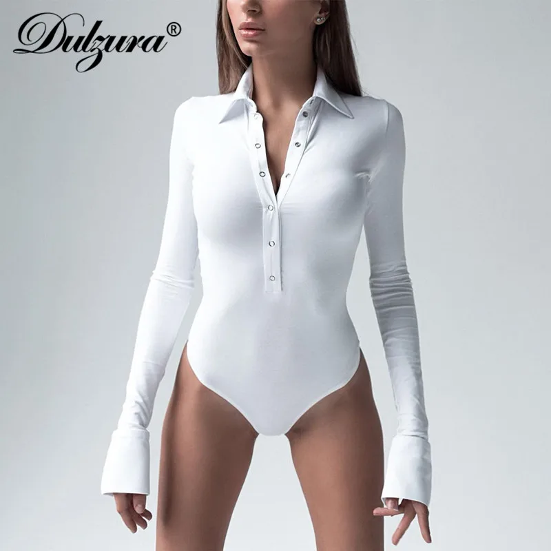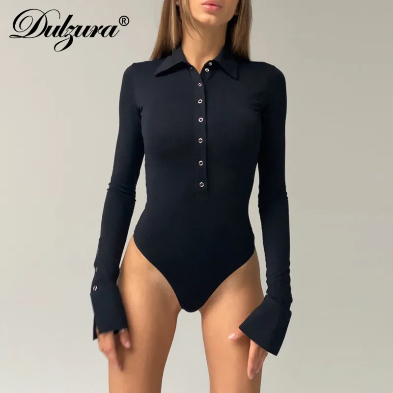Dulzura одноцветное для женщин с длинным рукавом боди с пуговицами; Отложной воротник; V-образная горловина; Хлопок с открытыми плечами облегающее сексуальное уличная 2020 осень-зима тела