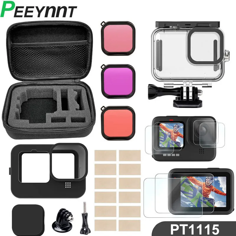 Черный комплект аксессуаров Peeynnt для Gopro Hero 9, водонепроницаемый корпус, закаленное защитное стекло для экрана, фильтры для объектива, крепление для Go Pro 9 PT1115