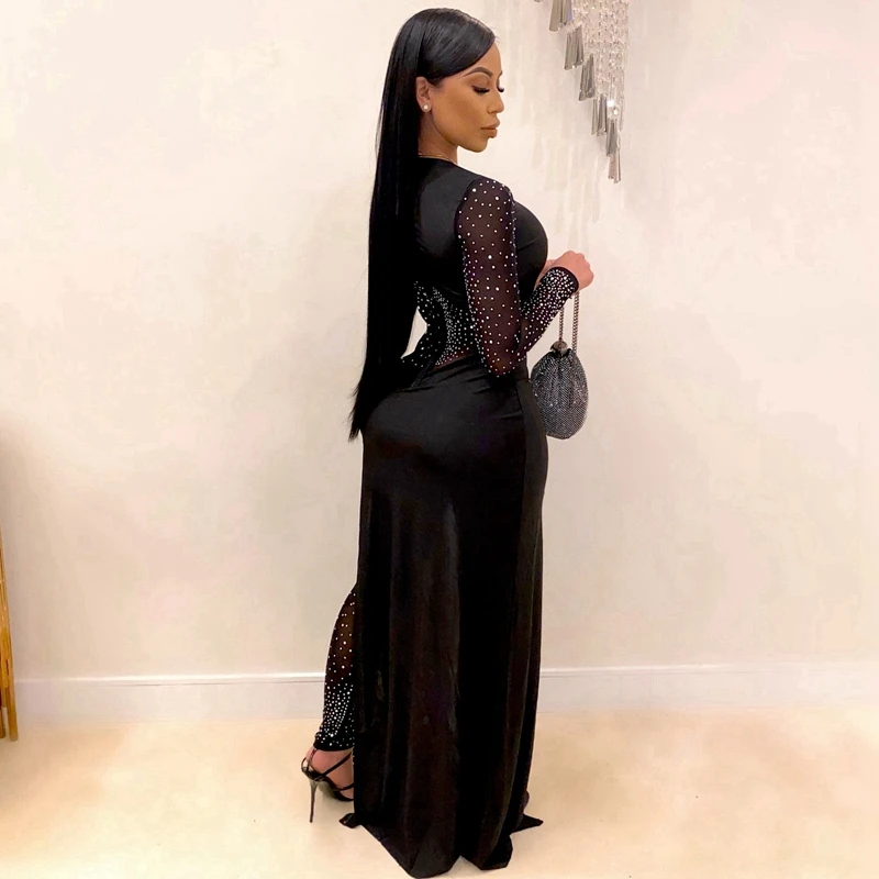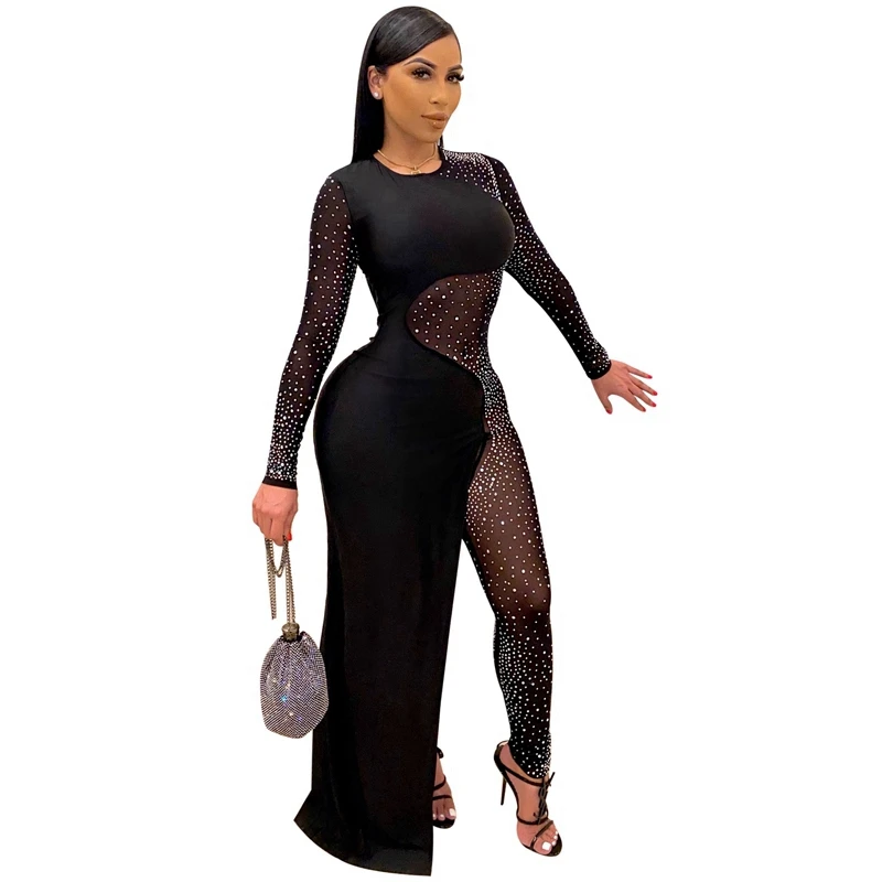 Черный сексуальный обтягивающий комбинезон, женский Комбинезон Элегантные стразы из прозрачной сетки для клуба, для вечеринки, комбинезон наряд из одного предмета для женщин комбинезоны для девочек