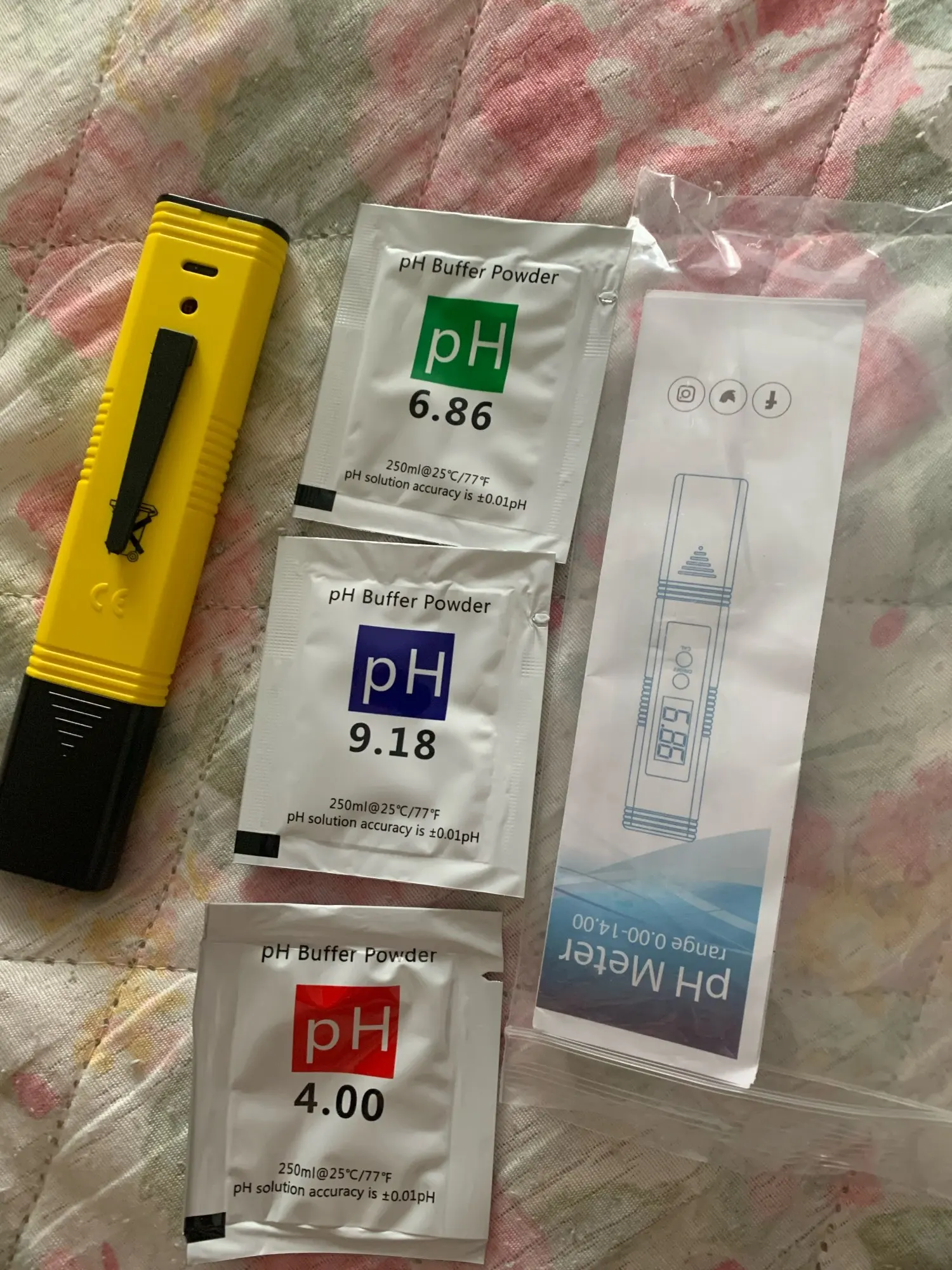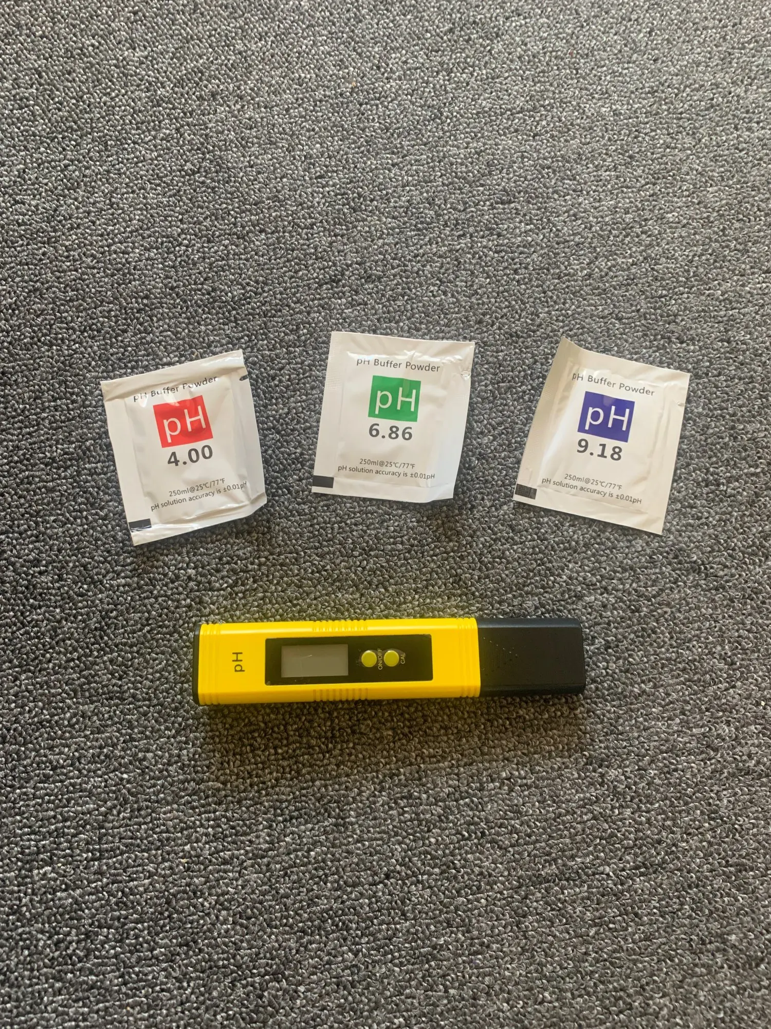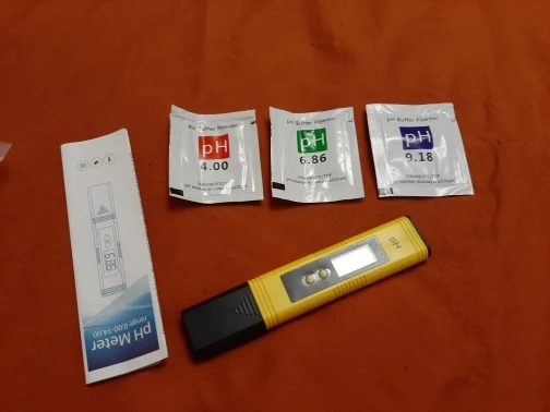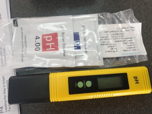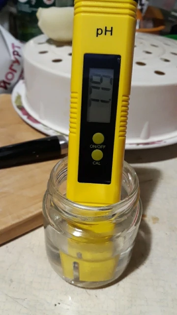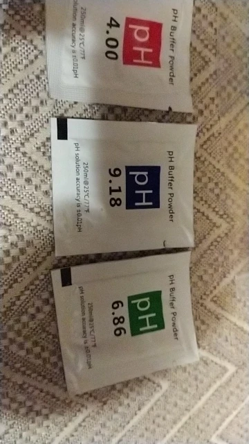 Сразу решил откалибровать: Купил дистилированную воду, нагрел до 25°С, разлил по двум сосудам (третий оставил на всякий случай). Развел пакетики 9.18 и 4.00. Прибор прошёл калибровку, показания немного колеблятся, но не критично, сотые доли мне не важны.
