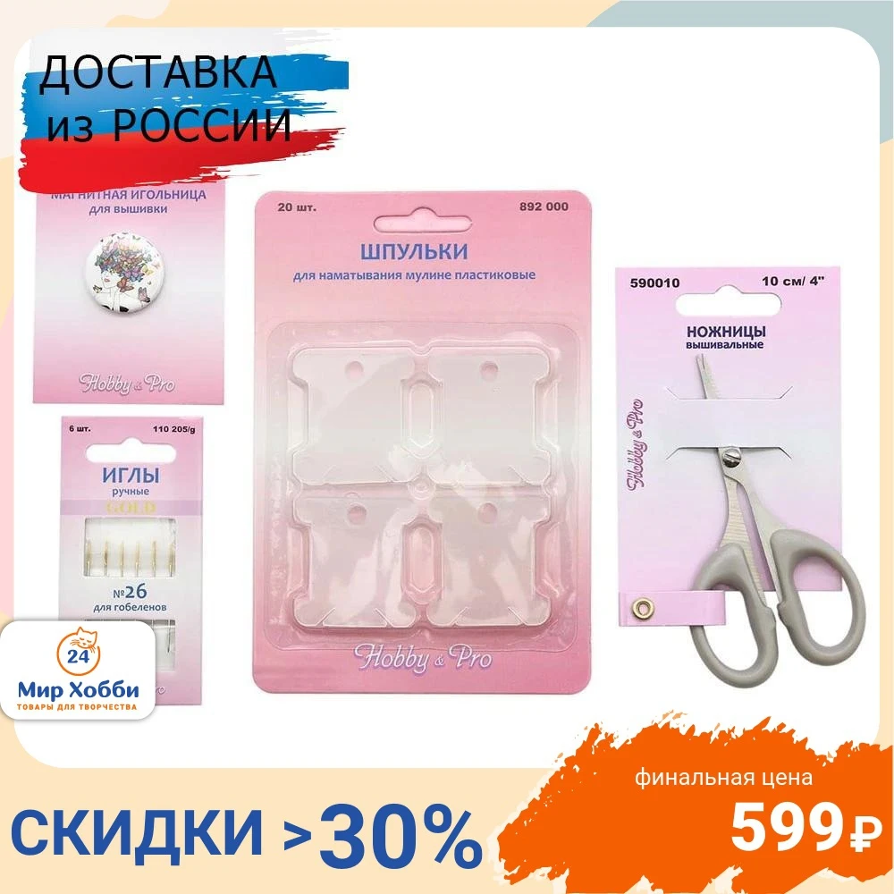 Аксессуары для вышивания из набора Hobby&Pro 'Базовый' порадуют вас своим качеством и функциональностью. Используйте этот набор, чтобы: – вышивать крестиком или гобеленовым швом по сетчатой канве с помощью специальной иглы с закругленным острием и удлиненным ушком; – аккуратно обрезать нитки с помощью вышивальных ножниц; – хранить нитки мулине необходимых цветов на многоразовых пластиковых шпульках; – использовать магнитную игольницу, чтобы игла во время перерыва случайно не потерялась. В наборе: – иглы вышивальные с золотым ушком для гобеленов №26, упак./6 шт.; – шпульки для наматывания мулине, пластик, упак./20 шт.; – магнитная игольница 'Вдохновение' 25*3 мм; – ножницы вышивальные 10 см/4'.
