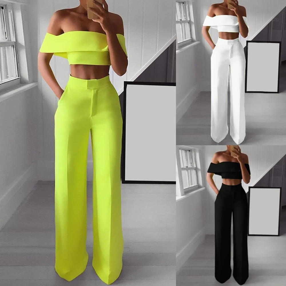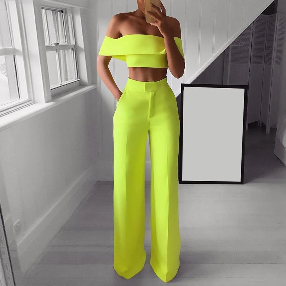 Женская неоновая зеленая одежда Женский комплект 2 шт., однотонный укороченный топ с открытыми плечами и широкие штаны 2021, пикантные летние костюмы из двух предметов
