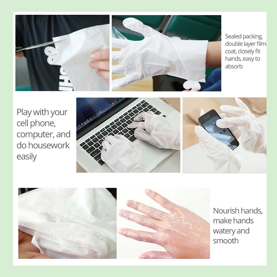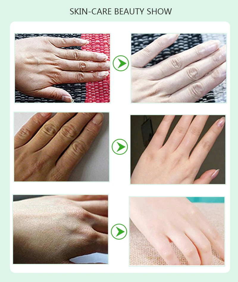 Использование:Шаг 1. Очистите руки, удалите изделие, нарежьте ножницами ручную пленку. Шаг 2. Набор пленки начал делать ручной светильник из ламинированной ткани рука в близком контакте с мембранной эссенцией. (Можно надеть на Обычные перчатки, ткань ближе к коже, так что пленка может свободно работать). Шаг 3. Около 20-40 минут, после того, как пленка отделится от рук, протрите руки в течение трех минут, сразу же видимые отбеливающие руки. Шаг 4. Одна рука, чтобы восстановить естественный белый, гладкий и мягкий, как ребенок.